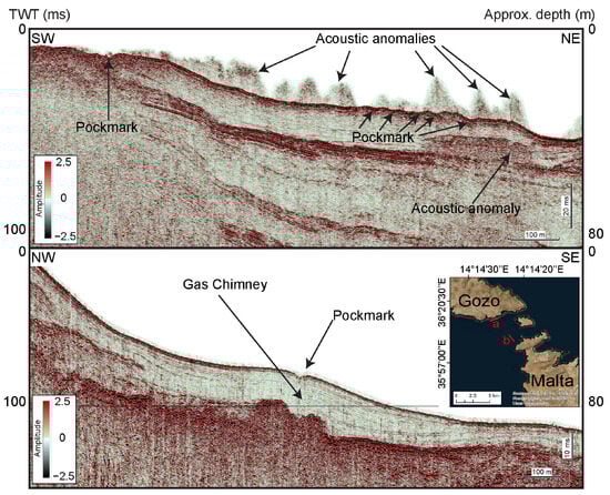 Sub-bottom profiles acquired offshore Malta showing small, aligned pockmarks in the upper panel, and a larger pockmark with a well-defined gas chimney in the lower panel. (Data from University of Malta, Malta). Location in the inset.