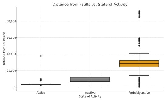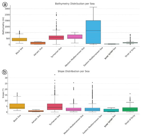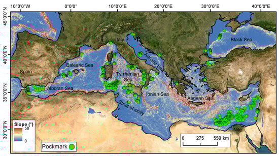 Starting from the public repository of pockmarks published by Spatola et al. (2025) [92] with 7516 valid pockmark records (Figure 6). Each pockmark entry includes up to 31 attributes, although not all fields are fully populated. The most complete and statistically relevant fields include: (i) Geographic location (Latitude, Longitude), (ii) Bathymetry (water depth in m), (iii) Slope of the seafloor (degrees), (iv) Distance from major faults, (v) Sediment thickness (Messinian, Plio-Quaternary, Pre-Messinian), (vi) Pockmark morphology (Mean axis, Internal depth, Shape), (vii) State of activity and fluid type (where available). This above-mentioned information was derived either from the reference articles or extracted from publicly available datasets (as raster, e.g., Sampietro et al. 2023 [128]) using the Extract Values to Points tool in ArcMap 10.8. General geomorphometric parameters (e.g., slope) were extracted from the bathymetric data by using ArcMap 10.8. The distance from two features (e.g., distance from pockmarks and faults) was calculated by using the tool Euclidian distance in ArcMap 10.8 (https://desktop.arcgis.com/en/arcmap/latest/tools/spatial-analyst-toolbox/Euclidean-distance.htm (accessed on 24 November 2025)). A summary table is reported below (Table 2). It is important to note that the sediment thickness data were derived from low-resolution raster datasets [128]. The authors locally calibrated the dataset using available seismic profiles, thereby improving its reliability in selected areas. This data is currently the only available dataset that provides full coverage of the Mediterranean region. Although the limited spatial resolution represents a constraint, it is generally acceptable for regional-scale analyses.