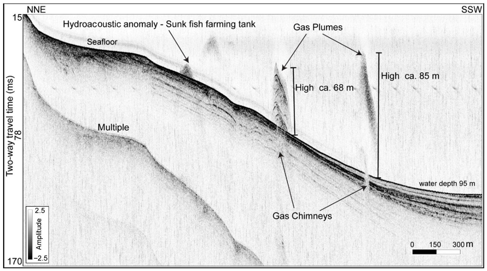 - Riedel, M.; Hähnel, L.; Bialas, J.; Bachmann, A.K.; Gaide, S.; Wintersteller, P.; Klaucke, I.; Bohrmann, G. Controls on Gas Emission Distribution on the Continental Slope of the Western Black Sea. Front. Earth Sci. 2021, 8, 601254. [Google Scholar] [CrossRef]
