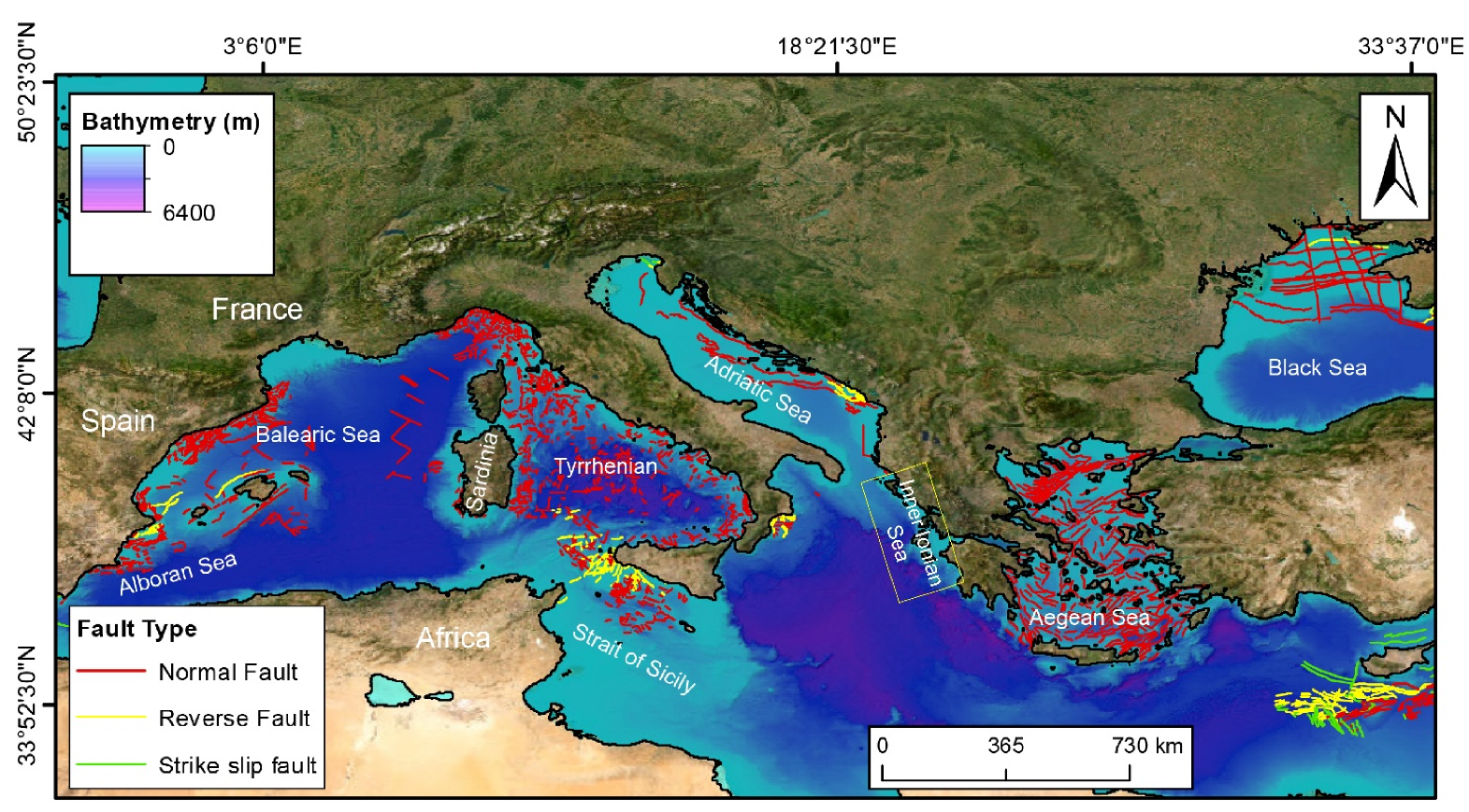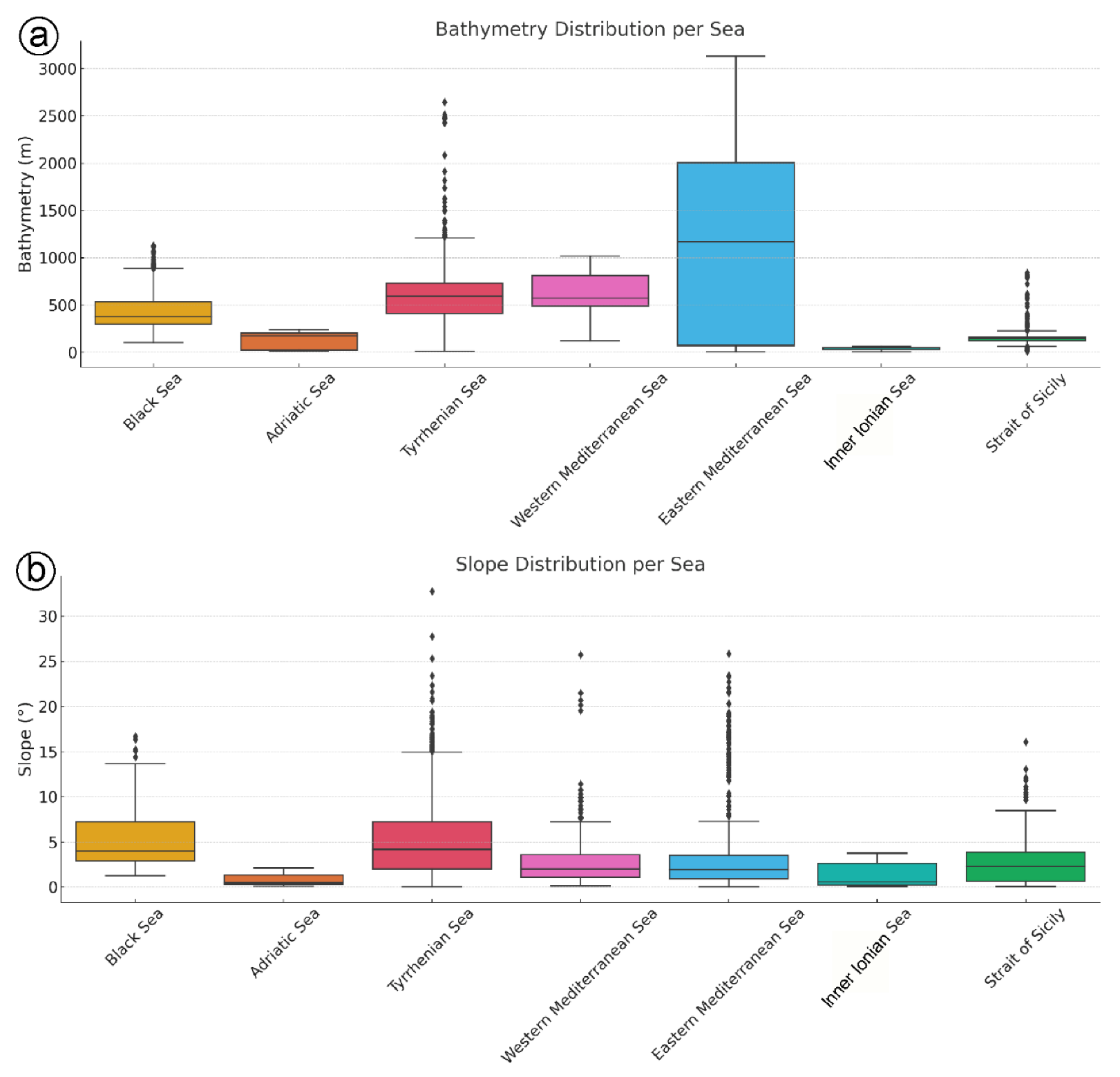 | Seas | Bathymetry (m)_Mean | Bathymetry (m)_Min | Bathymetry (m)_Max | Slope (°)_Mean | Slope (°)_Min | Slope (°)_Max | Distance from Faults (m)_Mean | Distance from Faults (m)_Min | Distance from Faults (m)_Max | Thickness of the Pre-Messinian Sediments (m)_Mean | Thickness Of The Pre-Messinian Sediments (M)_Min | Thickness of the Pre-Messinian Sediments (m)_Max | Thickness of Messinian Sediments (m)_Mean | Thickness of Messinian Sediments (m)_Min | Thickness of Messinian Sediments (m)_Max | Thickness of Plio-Quaternary Sediments (m)_Mean | Thickness of Plio-Quaternary sediments (m)_Min | Thickness of Plio-Quaternary Sediments (m)_Max |