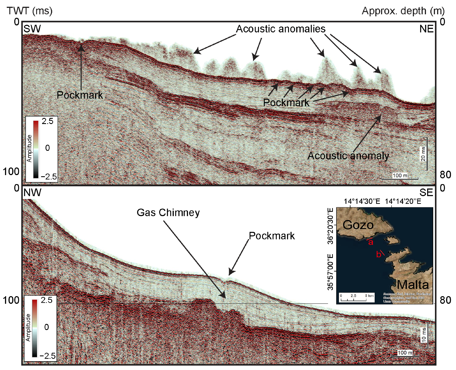 - Savini, A.; Malinverno, E.; Etiope, G.; Tessarolo, C.; Corselli, C. Shallow seep-related seafloor features along the Malta plateau (Sicily channel—Mediterranean Sea): Morphologies and geo-environmental control of their distribution. Mar. Pet. Geol. 2009, 26, 1831–1848. [Google Scholar] [CrossRef]