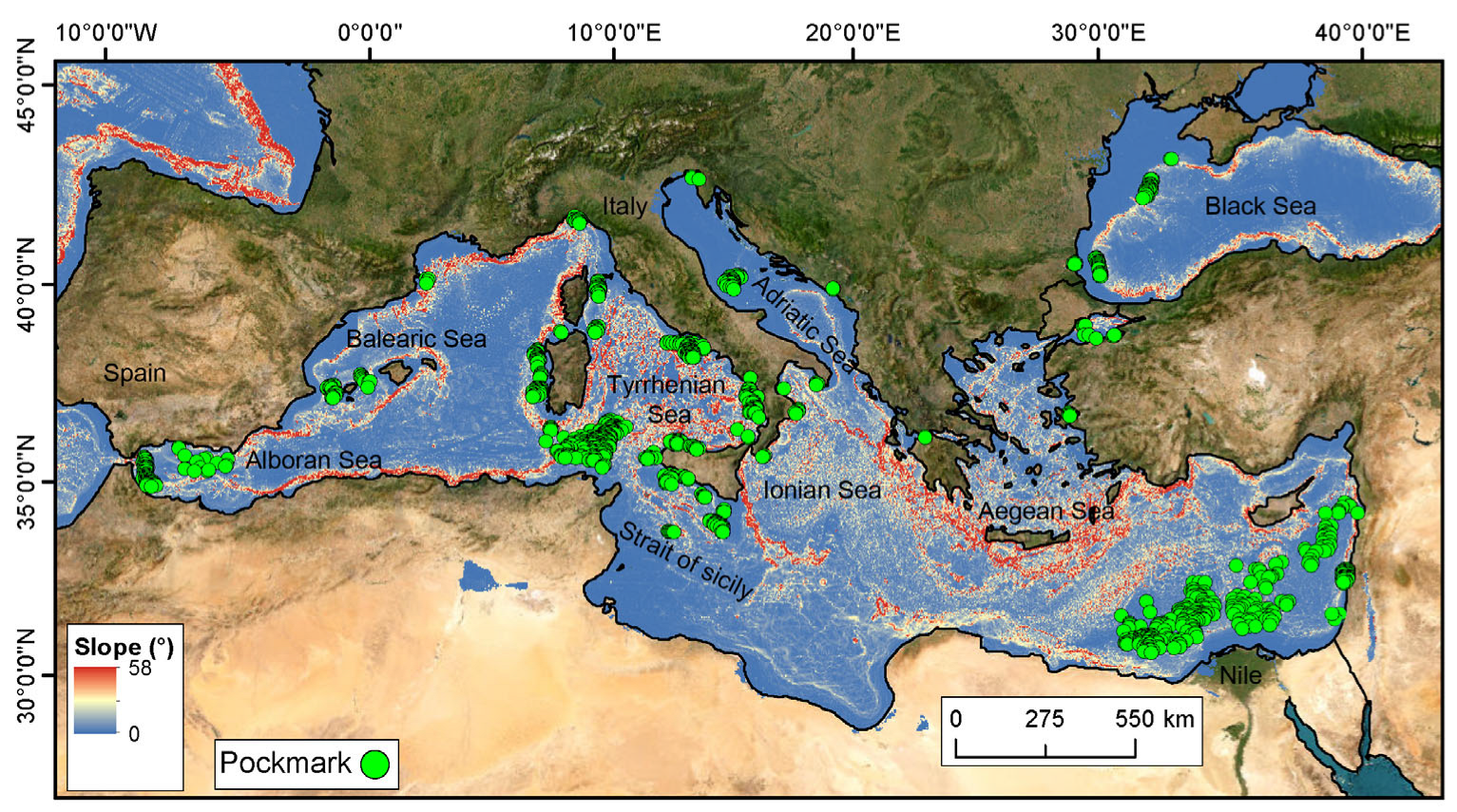 - Spatola, D.; Rovere, M.; Casalbore, D.; Chiocci, F.L. Pockmarks of the Mediterranean and Black Sea. Zenodo 2025. [Google Scholar] [CrossRef]