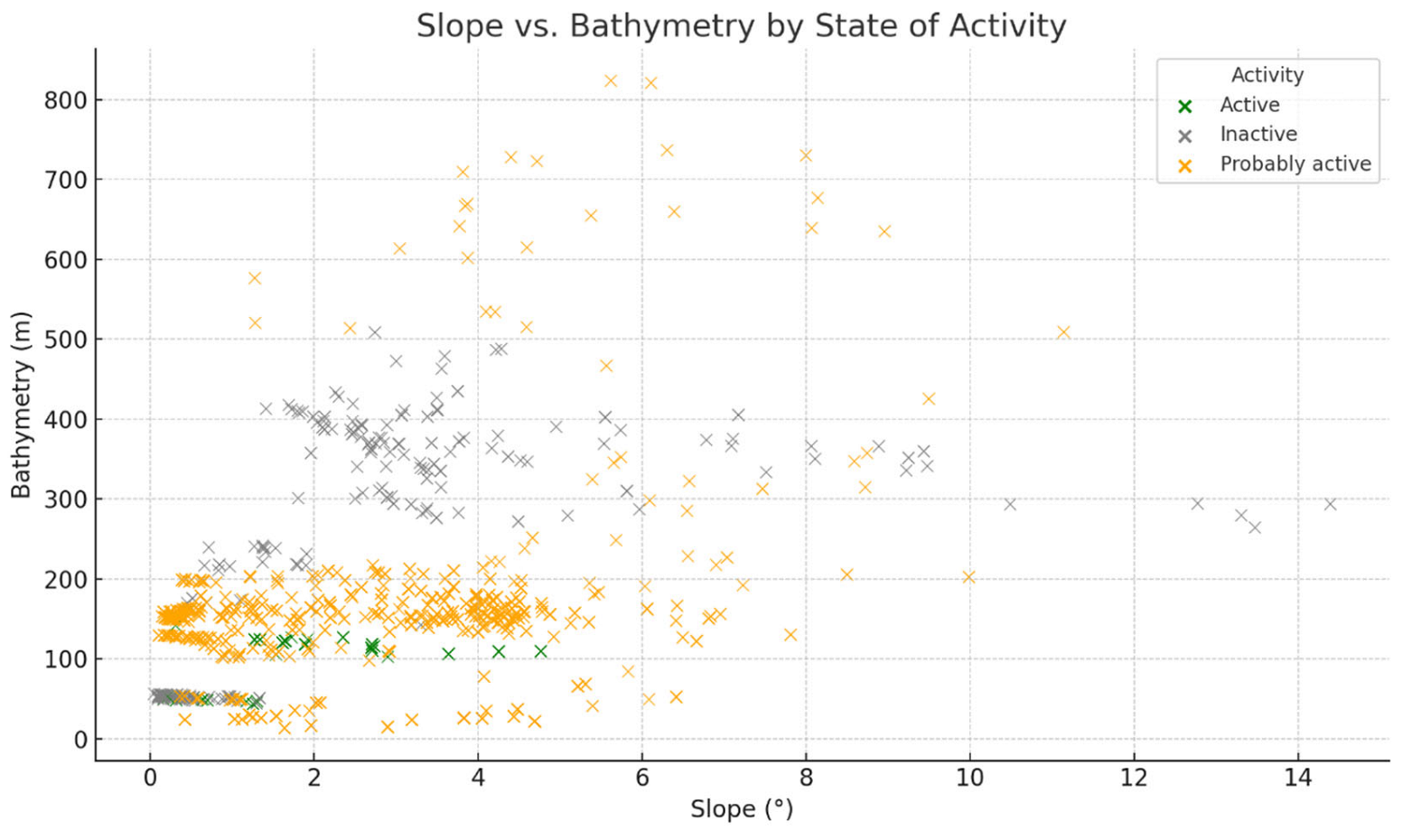 5.2. Analysis of Pockmark Activity States VS to Geomorphological and Stratigraphic Variables