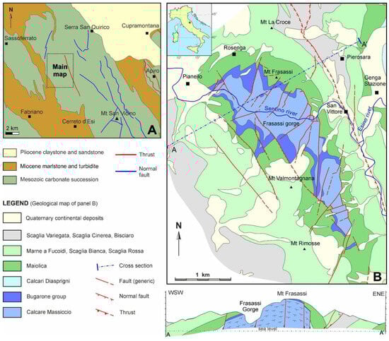 (A) Regional geological framework showing the location of the study area. (B) Simplified geological map of the Frasassi Gorge with accompanying cross-section. The complete geological map, including the full base map, cross-sections, and detailed lithostratigraphic information, is provided in Figure S1.