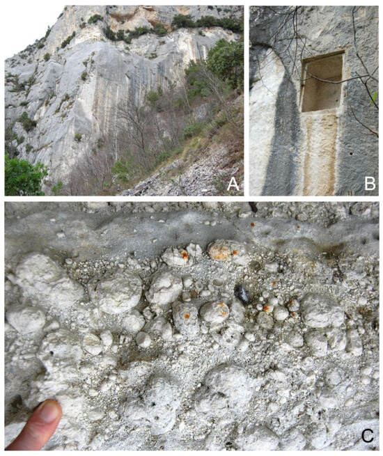 The homogeneous texture and ease of carving explain its long-standing use as a building and ornamental stone in public and religious buildings since Roman times and throughout the Middle Ages (Figure 5B). Poorly cemented horizons have promoted the formation of a prominent ledge along the gorge, where numerous superficial caves developed due to the crumbling of limestone caused by weathering processes (Figure 2).