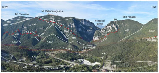 Panoramic view of the western limb of the Frasassi anticline, showing main faults and stratigraphic boundaries (viewpoint from ENE: 43°24′22′′ N 12°59′08′′ E). Labels: MAS—Calcare Massiccio; BU—Bugarone group; MAI—Maiolica; K—Cretaceous Fms; K–EO—Cretaceous–Eocene Fms.