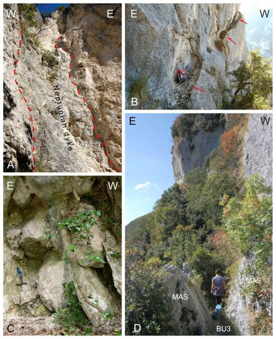 Neptunian dykes filled with Bugarone limestone. (A,B) Dykes on the southern slope of Mt Frasassi (outcrop location: 43°24′11′′ N 12°57′42′′ E). Mt Valmontagnana dykes: (C) Large dyke fill with boulders of BU1 and MAS in BU3 micrite (outcrop location: 43°23′50′′ N 12°57′46′′ E). (D) Open entrance of a neptunian dyke with bioclastic BU3 fill (outcrop location: 43°23′42′′ N 12°57′58′′ E). Labels: MAS—Calcare Massiccio; BU3—Aalenian–Bajocian Bugarone group limestone (sub-units as in the main text).