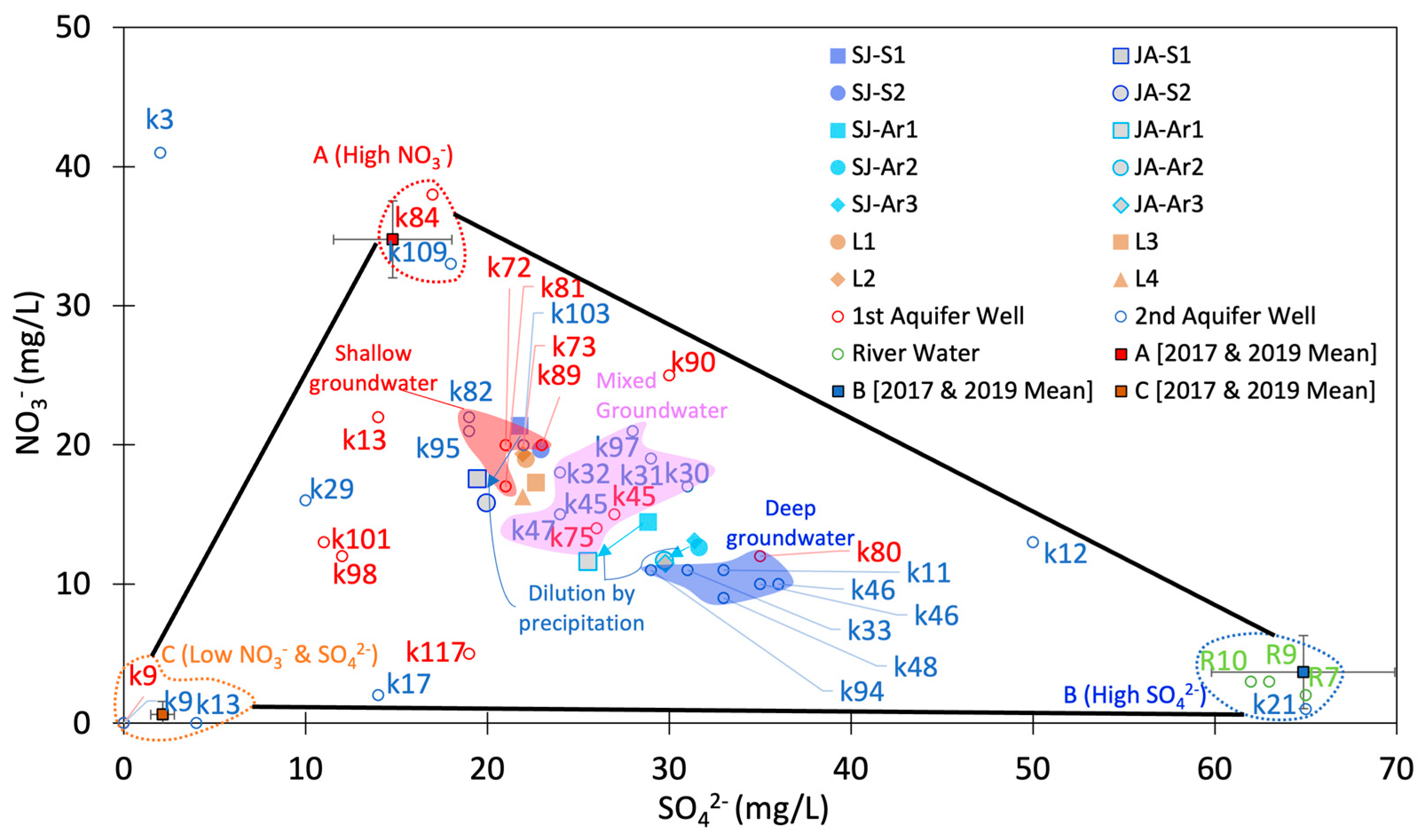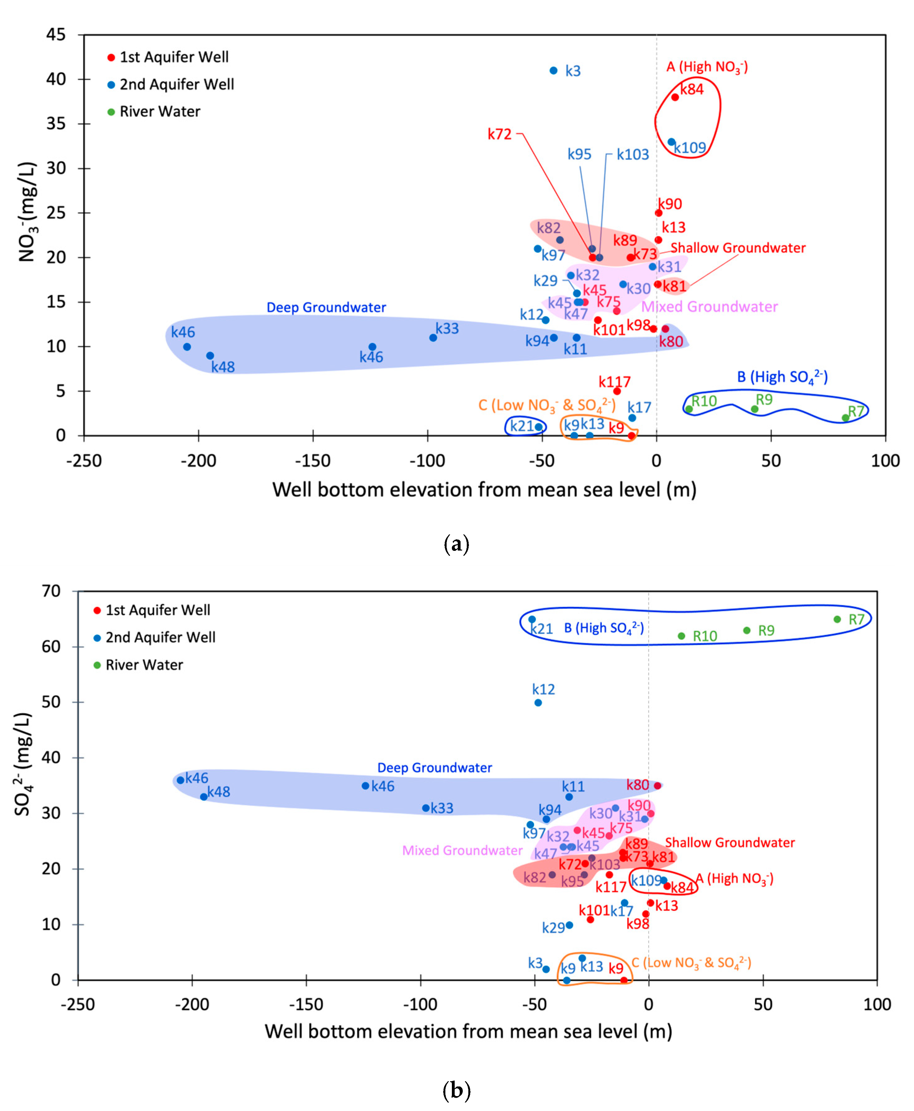 | Groundwater Type | Sample Counts | Well-Bottom Elevation (masl) | SO42− (mg/L) | NO3− (mg/L) | Calculated Mixing Ratio | ||