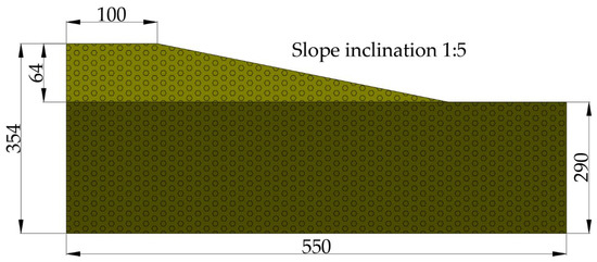 For the purpose of the analysis, a simplified geotechnical model of a slope was prepared, featuring a slope inclination of 1:5 and a total height of 64 m (Figure 2). It was assumed that both the subsoil and the embankment were composed of the same type of material-consolidated cohesive glacial till intermixed with coarse- and fine-grained sands. The geotechnical properties of the material were defined as follows: bulk unit weight γ = 20 kN/m3, Young’s modulus E0 = 100 MPa, Poisson’s ratio ν = 0.33, internal friction angle φ = 30°, and cohesion c = 5 kPa. These parameters were selected to reflect typical conditions observed in postglacial terrains and to ensure numerical stability of the model under dynamic loading conditions.