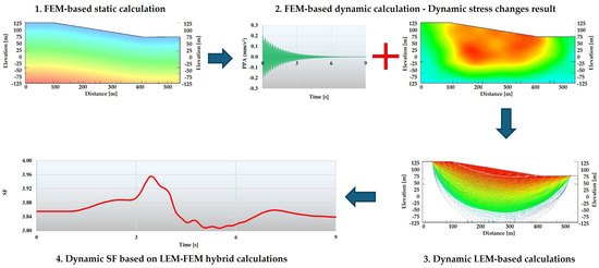 These simplifications and assumptions of the limit equilibrium method mean that it is not always possible to obtain a reliable stress distribution along the slip surface. Such an up-simplification can be bypassed in the case of implementing a relationship describing the stress–strain characteristics of the soil under the analyzed geometric, loading and material conditions. Considering such a relationship means ensuring the consistency of displacements in neighboring slices, which in turn leads to much more realistic stress distributions. One way to take into account the stress–strain relationship in the stability analysis is to first determine the stress distribution in the soil using the FEM analysis and then use these stresses in the stability analysis using the LEM, which, on the one hand, will allow for determining the permanent displacements within the calculation model, and on the other hand will be the basis for determining the dynamic change in the safety factor FS. A simplified procedure for calculating the dynamic change in the stability coefficient is shown schematically in Figure 3.