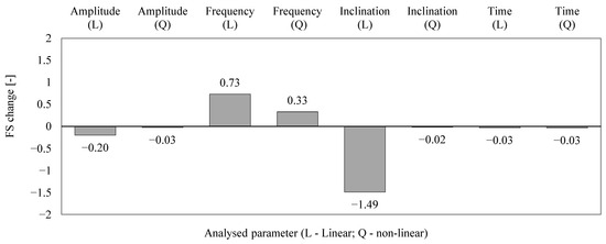 After completing calculations for all 27 models, the results necessary to implement the full three-level factorial design 3(k-p) were obtained. The computed safety factor values for each configuration are presented in Table 2. Based on the distribution of the dynamic safety factor FSdyn, a statistical analysis of variance was performed. The applied 3(k-p) factorial design allowed for the assessment of both linear (L) and quadratic (Q-nonlinear) effects of each input parameter (Figure 5). Ultimately, the variance analysis made it possible to determine which parameters have a statistically significant influence on the safety factor FS. According to the results, in addition to amplitude, the dominant frequency of seismic vibrations should also be considered a key parameter in numerical stability analyses.