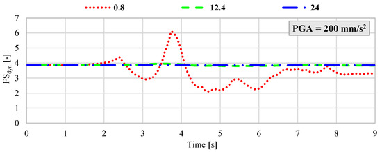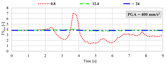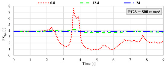 However, considering the ongoing mining operations in the vicinity of the protective pillar surrounding the Żelazny Most TSF, a reasonable scenario involves the occurrence of a seismic event with an energy release on the order of 5 × 108 J at a hypocentral distance of approximately 1500 m from the measurement station located on the dam. Under such circumstances, the estimated peak ground acceleration could reach values as high as 3000 mm/s2 [15]. Given this potential range, a hybrid FEM–LEM analysis was performed for the following maximum PGA values: 200 mm/s2; 400 mm/s2; 800 mm/s2; 1900 mm/s2; 3000 mm/s2. For each acceleration level, synthetic ground motion records were generated with dominant frequencies of 0.8 Hz, 12.4 Hz, and 24 Hz. The results, presented in Figure 6, Figure 7, Figure 8, Figure 9 and Figure 10, illustrate the dynamic variation in FSdyn for each analyzed scenario.