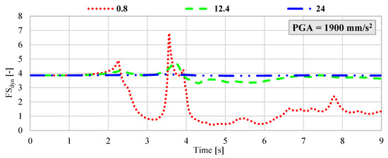 Dynamic variation in the FSdyn for a large-scale geotechnical slope model subjected to seismic excitation with a PGA of 400 mm/s2 and dominant frequencies of 0.8 Hz, 12.4 Hz, and 24 Hz.