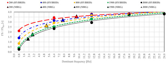 The initial analysis of the relationship between the minimum FSdyn and the dominant vibration frequency f was performed using independent logarithmic fits for each PGA level.