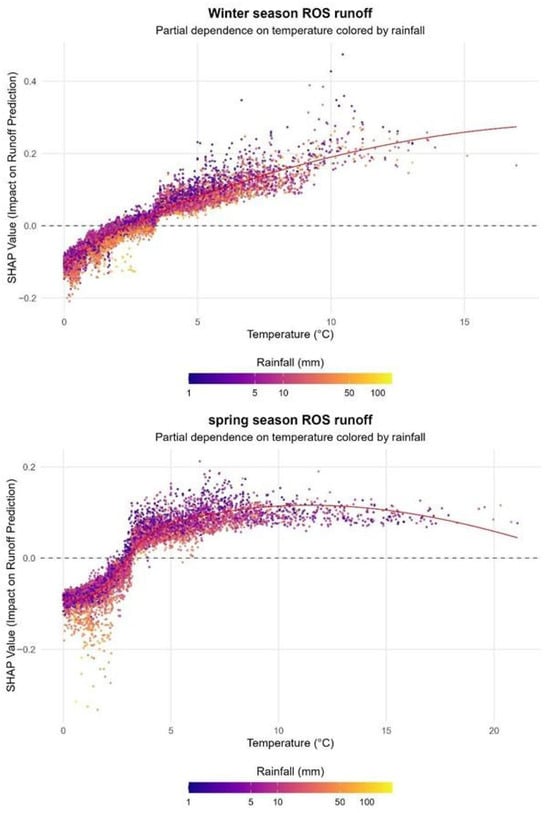 The partial dependence plots (Figure 4) for ROS runoff in the winter and spring seasons illustrate the relationship between air temperature and its impact on runoff prediction, while also considering snow depth as a contributing factor. In the winter season plot, there is a clear positive trend in SHAP values (impact on runoff prediction) as air temperature increases from 0 to approximately 10 °C. However, at air temperatures below approximately 2.5 °C (on the x-axis), the SHAP values are negative. This observation indicates that very low temperatures suppress runoff generation because they prevent significant melting of the snowpack. In these cold conditions, even areas with deep snow (represented by darker colors in the color gradient) do not experience substantial runoff, as the snow remains frozen and does not contribute to liquid water flow. The negative SHAP values reflect the inhibitory effect of these low temperatures on runoff, emphasizing that such conditions reduce the likelihood or amount of runoff compared to higher temperatures. In spring, beyond approximately 5 °C, SHAP values plateau and then decline, suggesting that higher temperatures may reduce runoff as snowpack becomes depleted or melting accelerates, promoting infiltration or evapotranspiration rather than surface runoff. However, at air temperatures below approximately 2.5 °C, SHAP values are still negative, indicating that runoff is suppressed due to the lack of snowmelt. The transition to positive SHAP values occurs at around 2.5 °C in both spring and winter, reflecting the threshold temperature at which melting begins to occur and runoff generation becomes more likely.