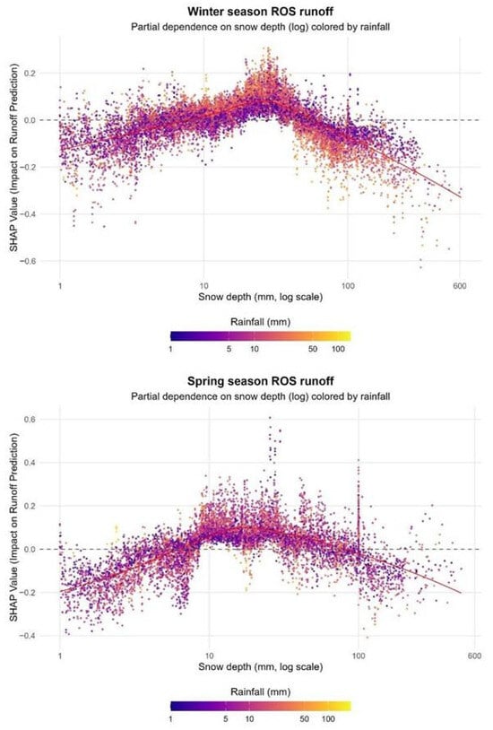 The partial dependence plots for ROS runoff in the winter and spring seasons are shown in Figure 5. The x-axis represents snow depth (in millimeters, plotted on a log scale), while the y-axis shows the SHAP value, which quantifies the marginal effect of snow depth on the predicted runoff. In the winter season plot, SHAP values (impact on runoff prediction) are predominantly negative across most snow depth ranges. This indicates that, during winter, snow accumulation generally suppresses ROS runoff rather than enhancing it. At low snow depths (below approximately 10 mm), SHAP values remain negative, suggesting that shallow snowpacks do not contribute significantly to runoff. As snow depth increases from 5 mm to around 50–60 mm, SHAP values become slightly positive, implying that moderate snow depths have a positive effect on runoff generation. Beyond this range, SHAP values continue to decline, indicating that very deep snowpacks further suppress runoff. The color gradient representing total ROS rainfall shows that larger rain (darker colors) tends to mitigate the negative impact of snow depth on runoff, but at higher snowpack the overall trend remains negative. This suggests that during winter, snow acts more as a storage medium rather than a direct source of runoff due to the cold conditions inhibiting melting.
