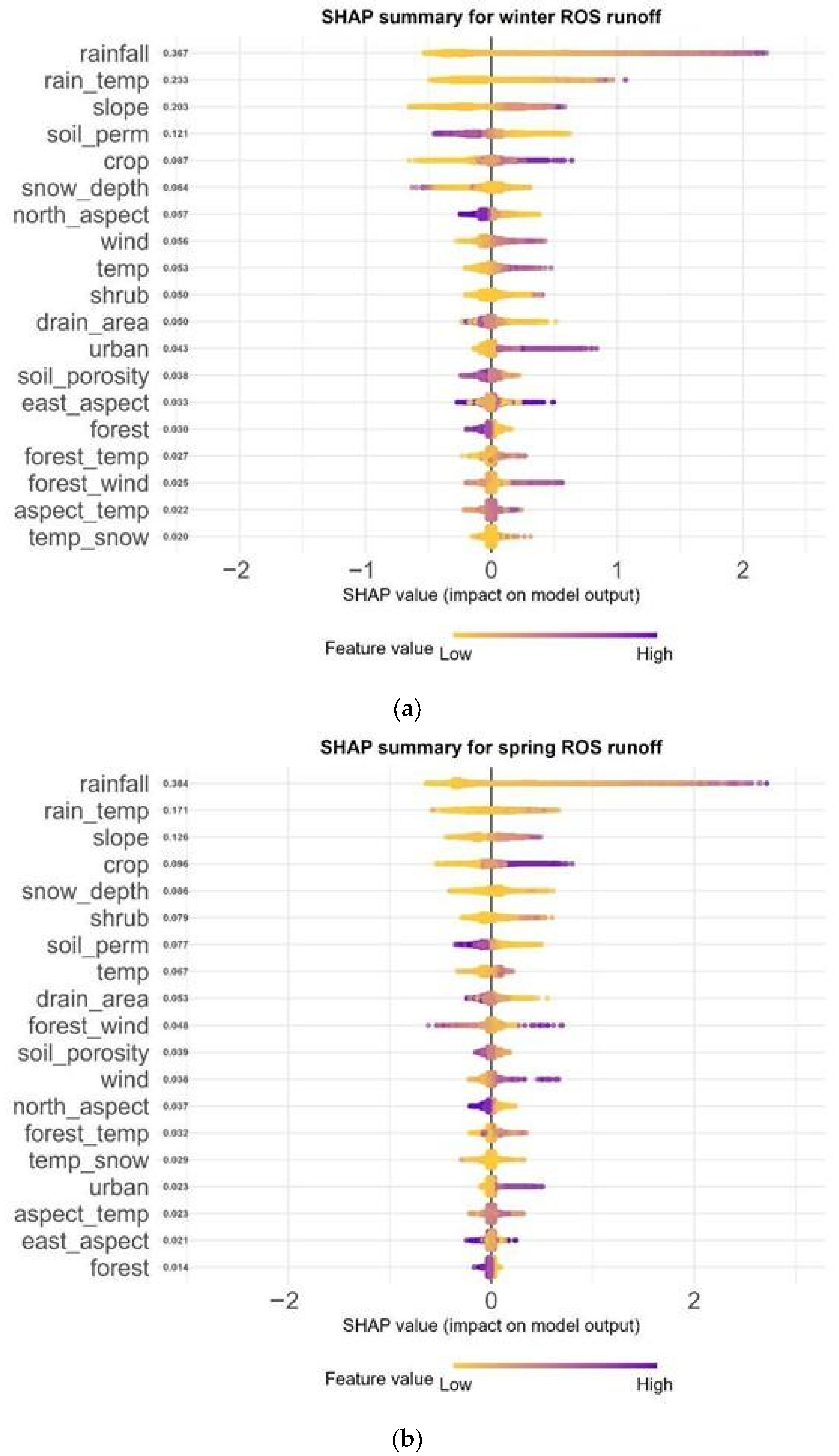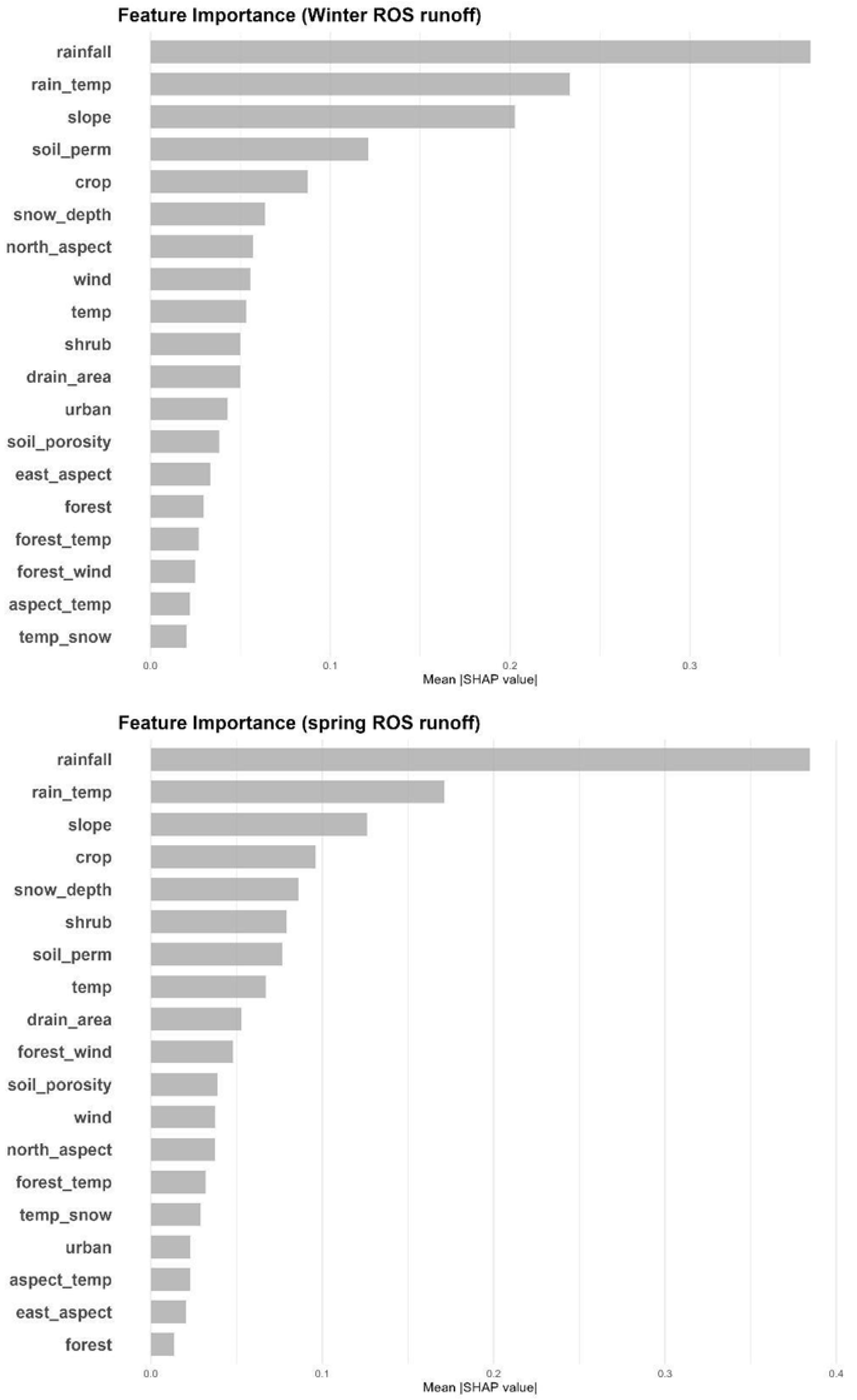 - During winter, runoff is predominantly governed by climatic factors including rainfall intensity, air temperature, and their interactions, with soil permeability and north-facing slopes playing important secondary roles. In contrast, spring ROS events show increased sensitivity to land cover characteristics, particularly crop and shrub cover, as vegetation-driven processes become more influential with rising temperatures.