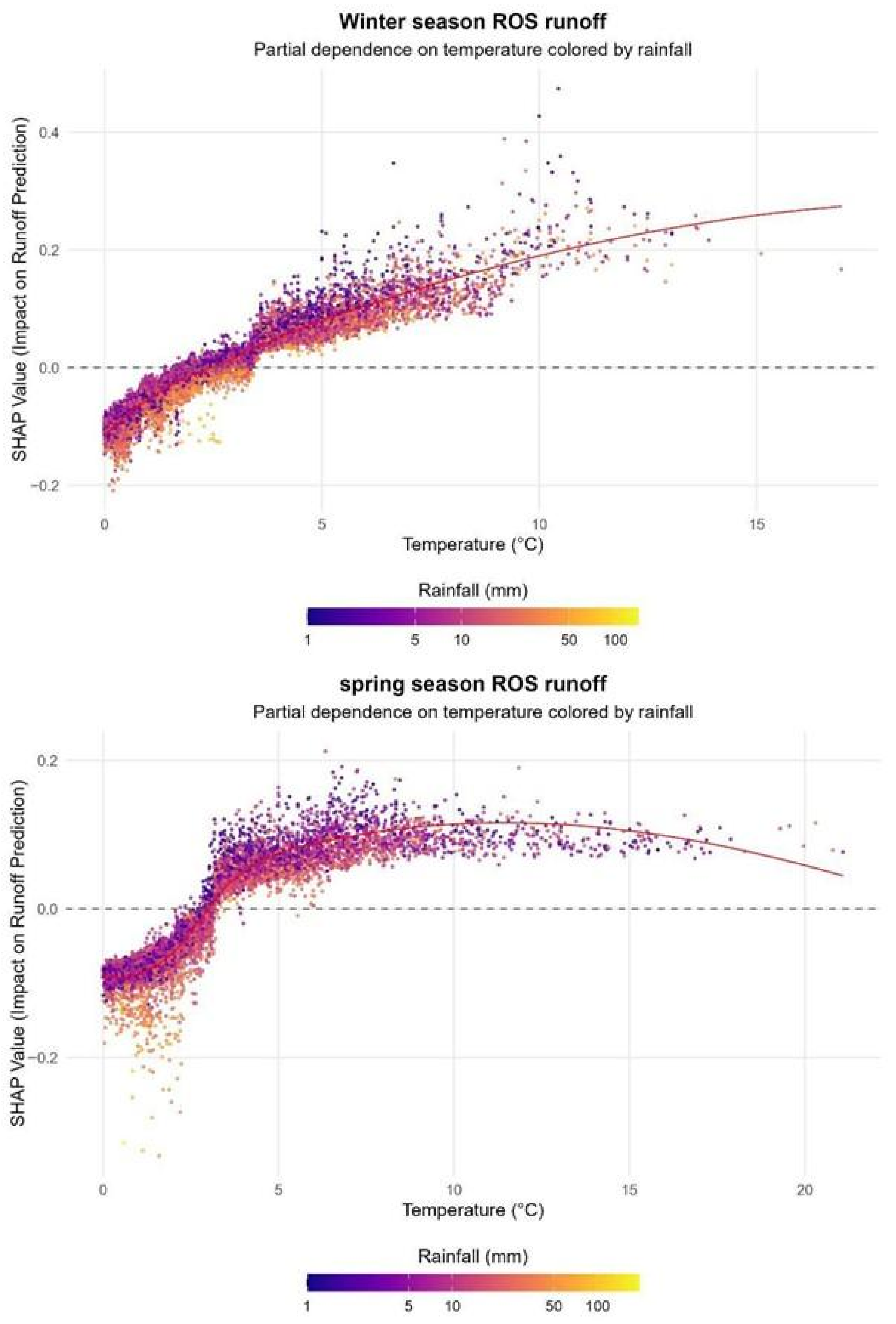 - Snow depth and temperature effects vary markedly between seasons. Snow depth effects shift from predominantly negative in winter, where snow acts as a storage medium, to positive contributions in spring at shallow to moderate depths as melting potential increases. Air temperature below approximately 2.5 °C tends to suppress ROS runoff in both winter and spring seasons.
