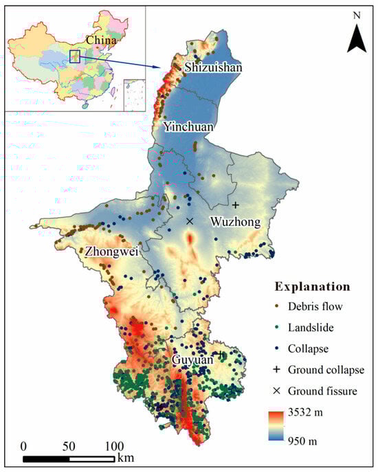 Geographic location and topographic setting of the study area in the Loess Hilly Region of Ningxia, Northwest China, including elevation contours and the spatial distribution of recorded mass movement points (landslides, collapses, debris flows, ground fissures). Major cities and counties are labeled for reference. Coordinate reference: WGS-84 UTM Zone 48 N; gridlines omitted for map clarity.