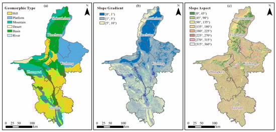 Topographic indicator layers used in susceptibility assessment. (a) Geomorphic landforms classified into five major types (mountains, hills, plateaus, deserts, and basins). (b) Slope gradient map reclassified into five terrain-based intervals. (c) Aspect categories grouped into eight directional classes reflecting differential microclimatic influences. Coordinate reference: WGS-84 UTM Zone 48N; gridlines omitted for map clarity.