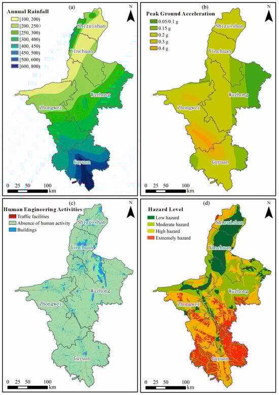 The external component captures short-term dynamic processes including precipitation intensity and seismic activity, both of which directly trigger slope failures. Rainfall data were obtained from the China Meteorological Administration, representing a 30-year average (1993–2022) with a spatial resolution of 1 km. Peak Ground Acceleration (PGA) values were taken from the China Seismic Intensity Zonation Map (1:1,000,000) published by the China Earthquake Administration. The geological map used in this study is at a scale of 1:250,000, compiled from the Geological Survey of Ningxia and verified through field mapping.