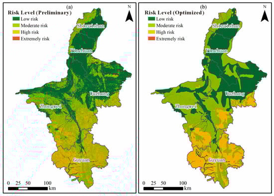 Mass movement risk zoning results. (a) Preliminary risk zoning map obtained through overlaying susceptibility, hazard, and exposure layers. (b) Final optimized risk zoning map after spatial generalization and cluster merging to reduce fragmentation. Coordinate reference: WGS-84 UTM Zone 48 N; gridlines omitted for map clarity.