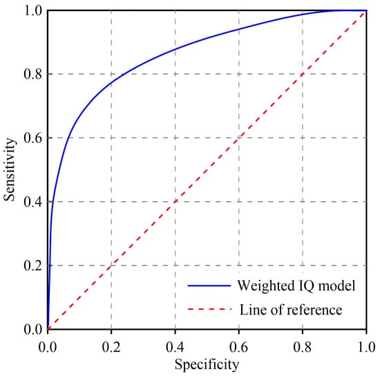 The predictive reliability of the mass movement susceptibility model was quantitatively evaluated using the Receiver Operating Characteristic (ROC) curve, a standard statistical tool for assessing model performance [54,55]. The Area Under the Curve (AUC) serves as a key metric reflecting the model’s ability to distinguish between hazard and non-hazard occurrences. The x-axis of the ROC plot represents the cumulative proportion of the total study area ranked by ascending IQ values, whereas the y-axis denotes the cumulative proportion of correctly predicted mass movement occurrences within corresponding IQ intervals. An AUC value greater than 0.5 indicates model discrimination above random chance, and values approaching 1.0 denote excellent predictive accuracy. Specifically, AUC values between 0.5 and 0.7 indicate low reliability, 0.7 and 0.9 indicate high reliability, and values >0.9 signify very high precision [56].