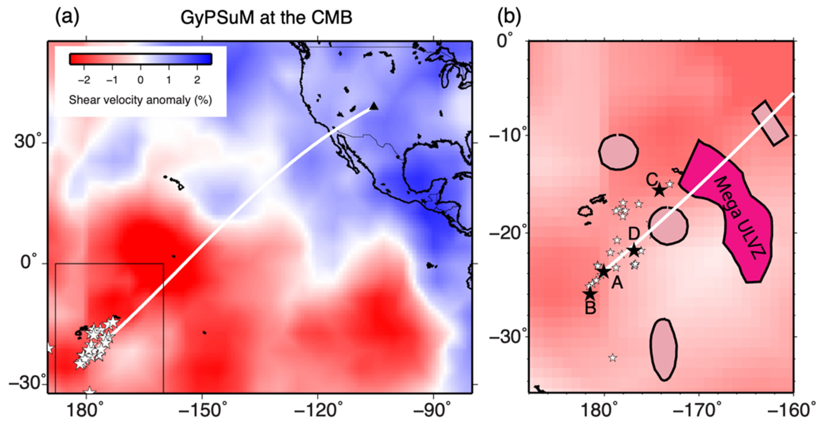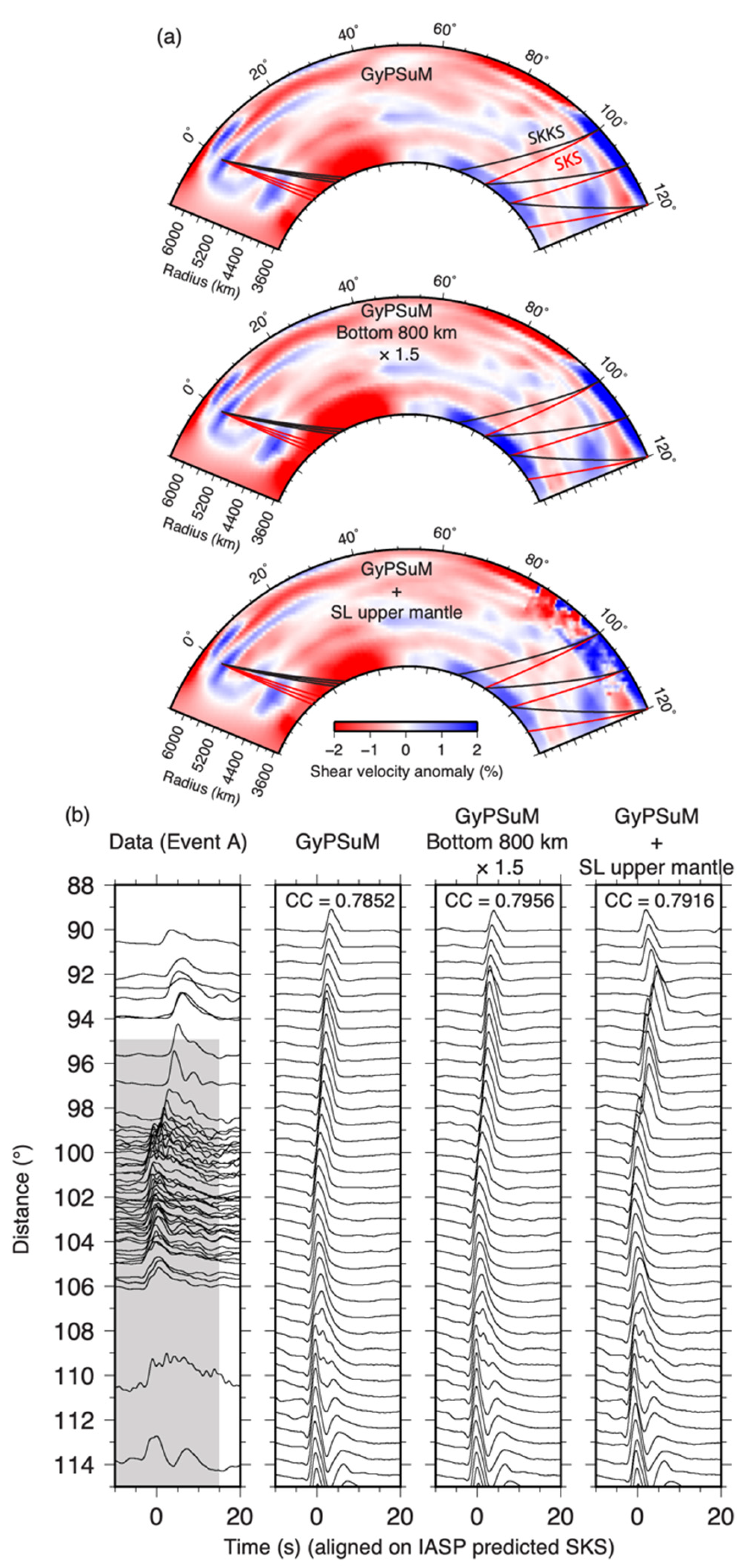 - Otsuru, K.; Kawai, K.; Geller, R.J. Subducted Slab Slipping Underneath the Northern Edge of the Pacific Large Low-Shear-Velocity Province in D”. J. Geophys. Res. Solid Earth 2025, 130, e2024JB030654. [Google Scholar] [CrossRef]