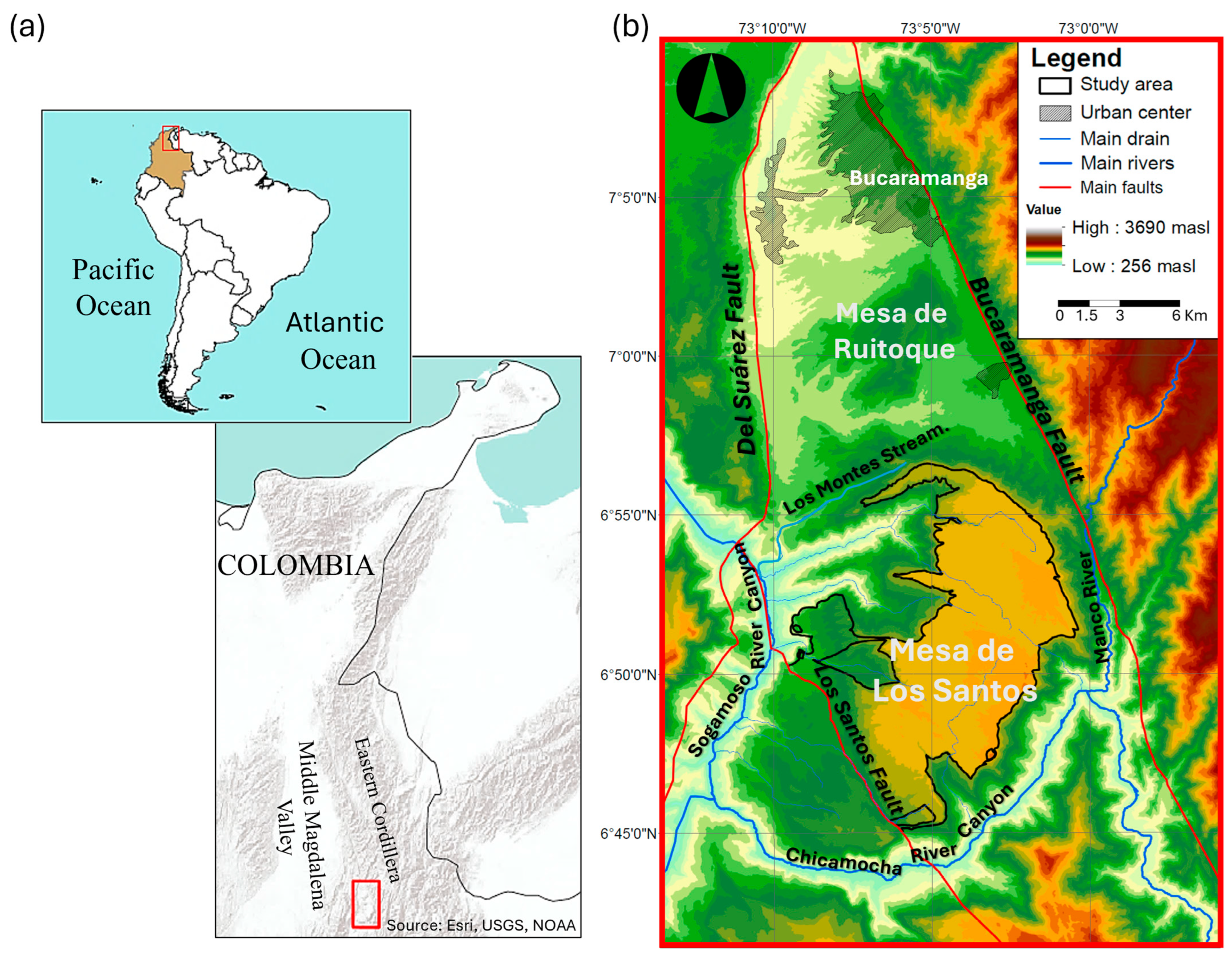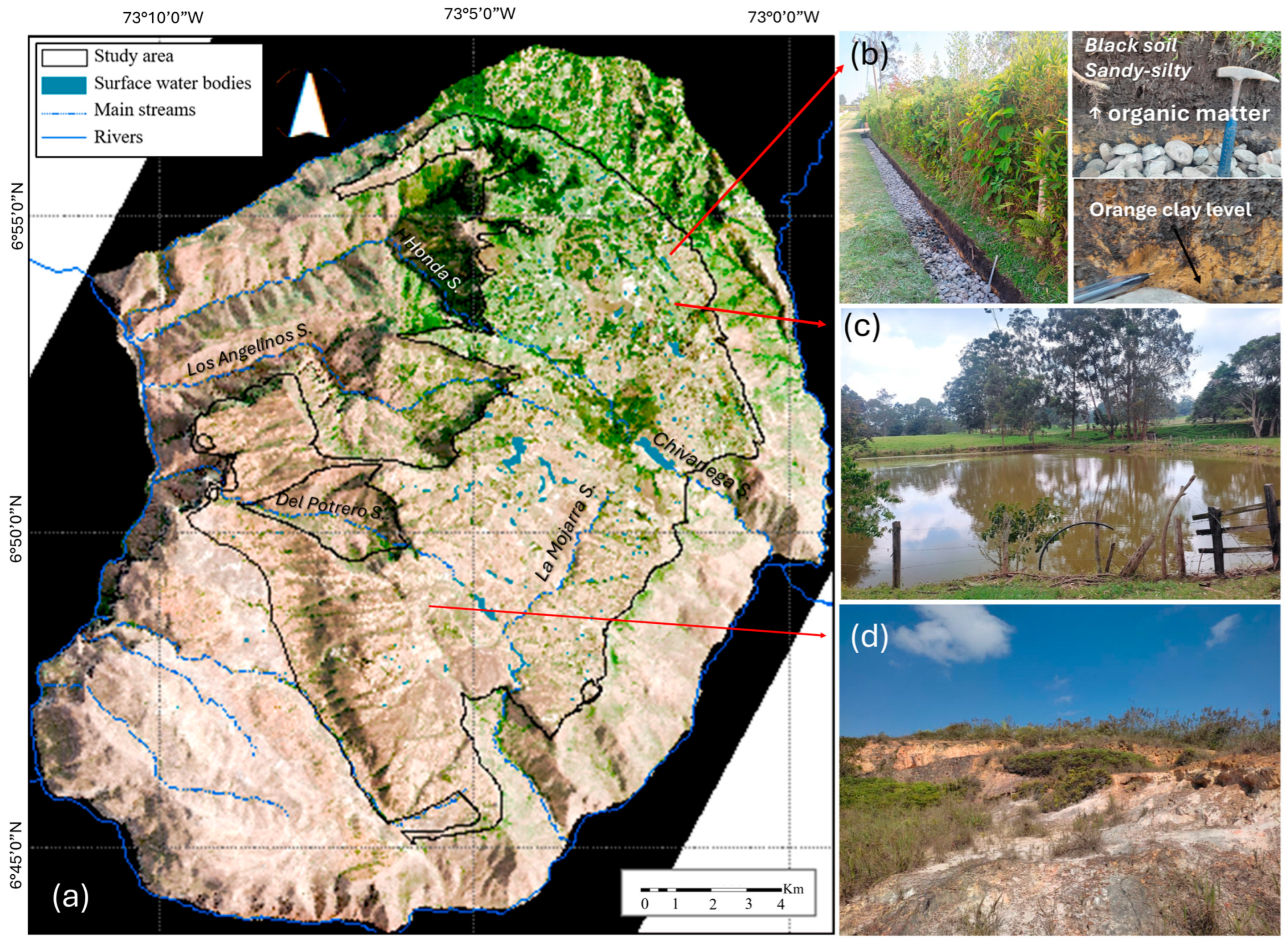 - Moreno, M.L.; Silva, K.D. Identificación de Ambientes Geomorfológicos y Elaboración de un Mapa de Favorabilidad para la Percolación de la Zona de la Mesa de Los Santos, Santander. In Trabajo de Grado Para Optar Por el Título de Geólogo; Universidad Industrial de Santander: Bucaramanga, Colombia, 2021. Available online: https://noesis.uis.edu.co/handle/20.500.14071/41138 (accessed on 1 February 2025).