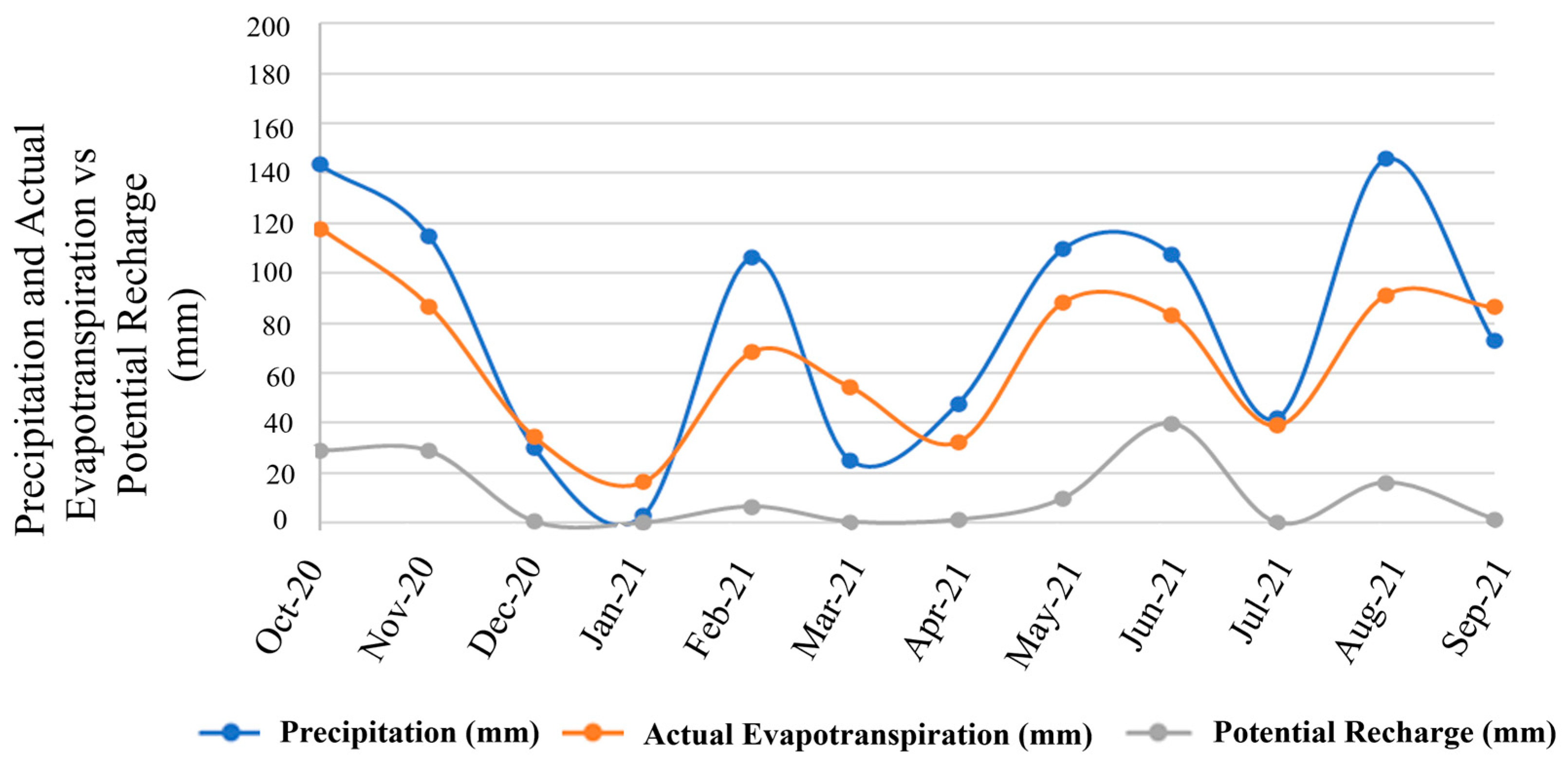 | 22 | W9 | Well | 1636.0 | 5.5 | 1.7 | 1634.3 | 102 | 5.98 | 21.67 | −3.67 to −2.74 | −5.68 to −4.02 | Evaporated | Nearby surface water body and Black soil development | livestock |