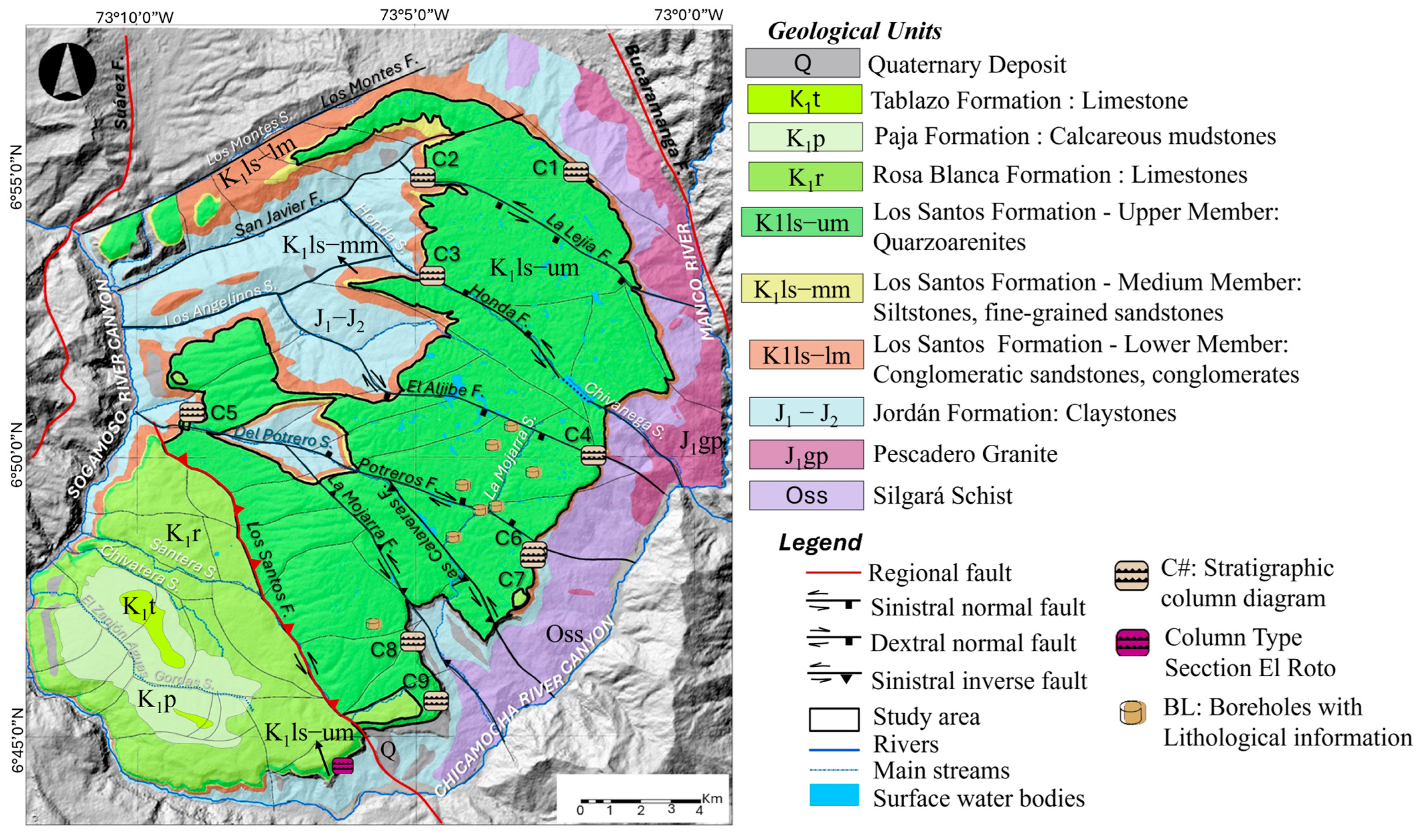 - Pinto, J.E.; Clavijo, J.; Gómez, S.; Bermoudes, O. Geological and hydrogeological research project in Mesa de Los Santos, northeast sector of Curití and western edge of the Santander Massif, department of Santander. In Explanatory Report on the Geological and Hydrogeological Research in Mesa de Los Santos and the Northeast Sector of Curití; Instituto Colombiano de Geología y Minería: Bucaramanga, Colombia, 2007. [Google Scholar]