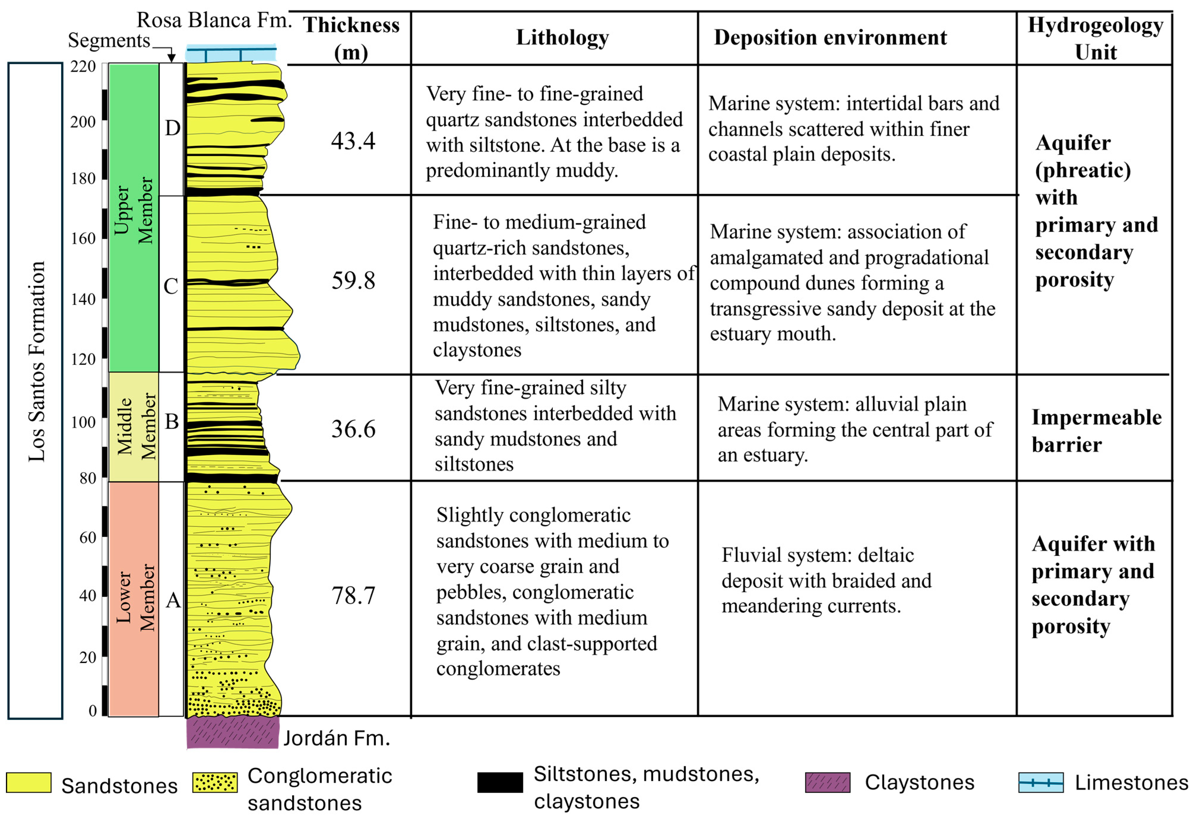 - Middle Member (51 m, segment B): a sequence of thin to medium tabular layers with irregular, well-defined contacts, composed of very fine to very coarse-grained sandstone with color variations ranging from violet to light gray and, to a lesser extent, light green. These sandstones are interbedded with medium to very thick layers of siltstone and mudstone in violet and green shades, containing muscovite. The sandstone grains are subrounded to subangular and are composed of quartz, black lithics, iron oxides, glauconite, plagioclase, and potassium feldspar, with a siliceous cement. Compositionally, the sandstones are classified as quartz arenites to sublitharenites. These layers exhibit very low primary porosity and no permeability, acting as a seal that separates the aquifers of the Upper Member and the Lower Member.
