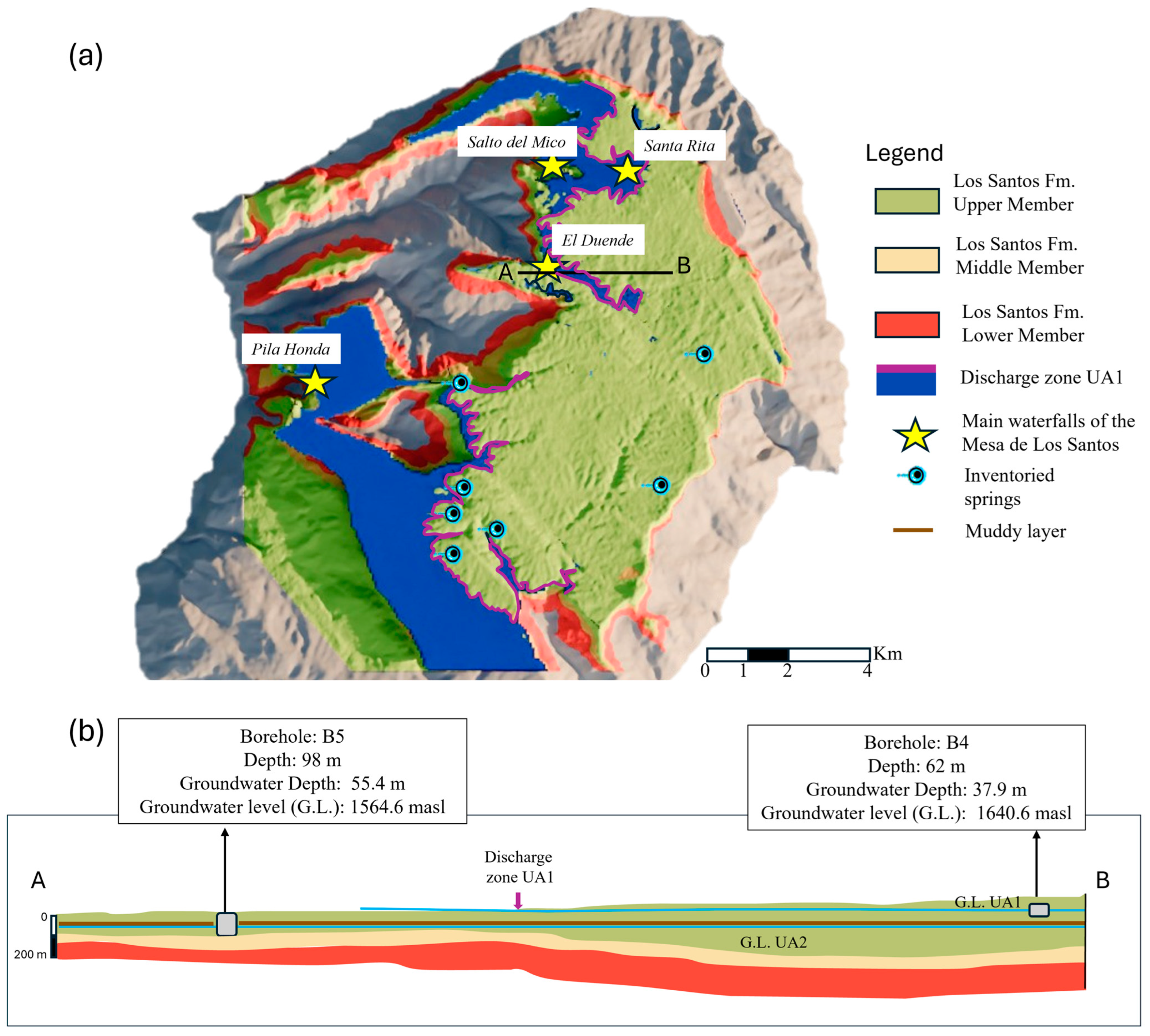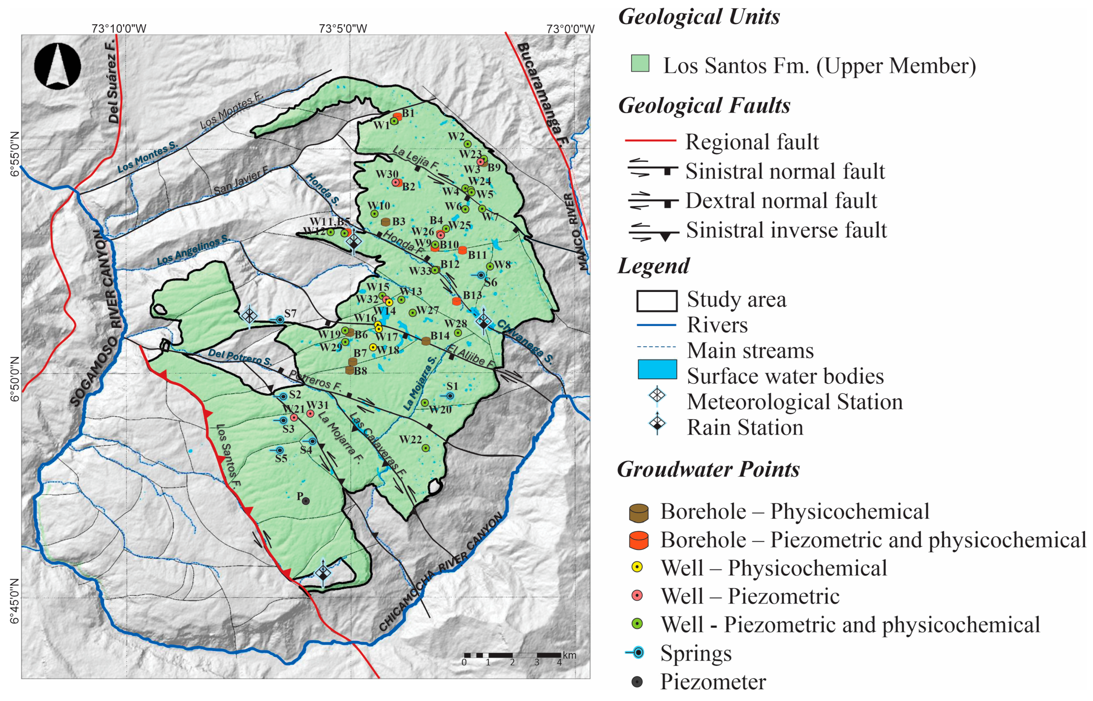 - Díaz, E.J.; Contreras, N.M.; Pinto, J.E.; Velandia, F.; Morales, C.J.; Hincapie, G. Evaluación hidrogeológica preliminar de las unidades geológicas de la Mesa de los Santos, Santander. Bol. Geol. 2009, 31, 61–70. [Google Scholar]