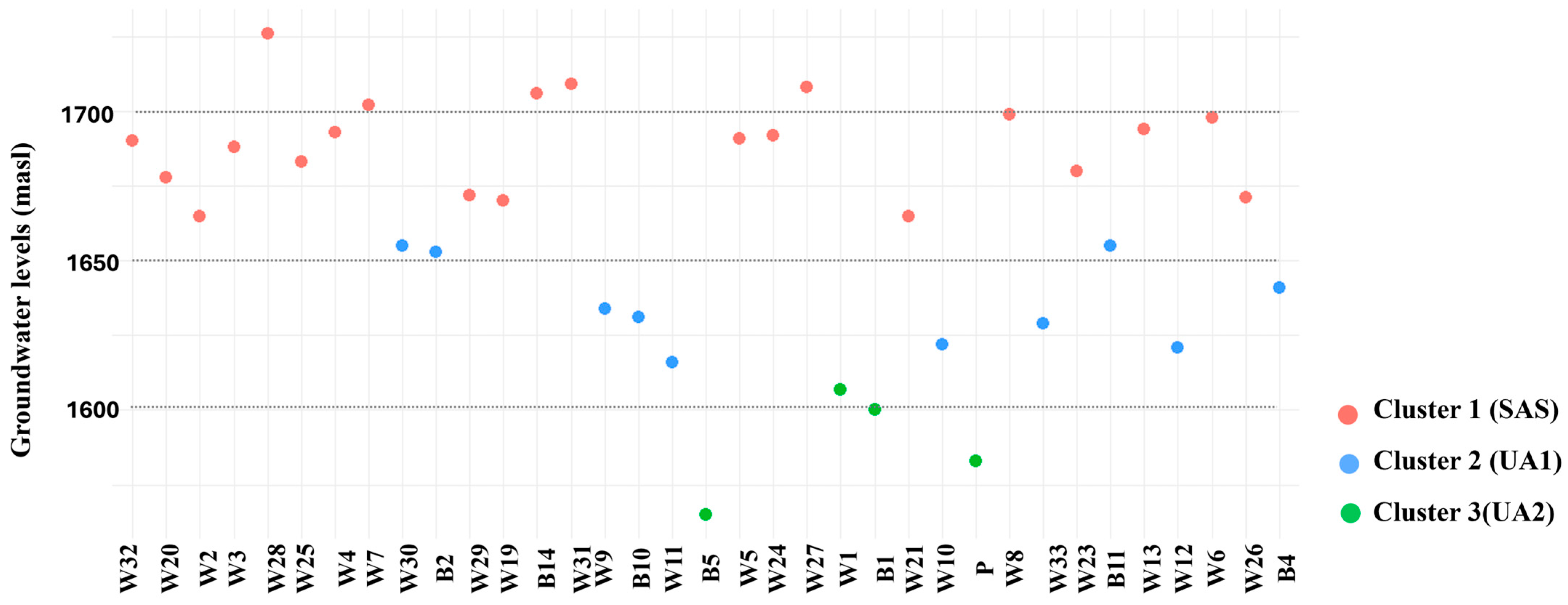 | 30 | B10 | Borehole | 1649.5 | 81 | 18.1 | 1631.5 | 77 | 6.13 | 22.69 | −6.15 * | 5.47 * | Low variability | Human consumption | |