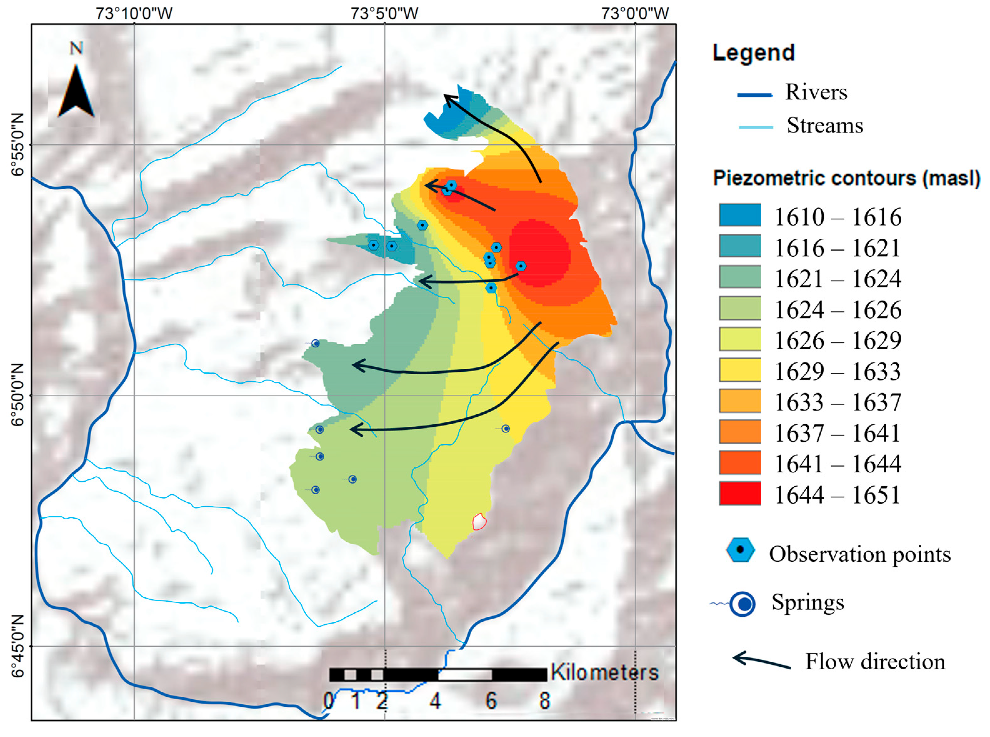 - Cetina, M.; Taupin, J.D.; Gómez, S.; Patris, N. Hydrodynamic conceptual model of groundwater in the headwater of the Rio de 774 Oro, Santander (Colombia) by geochemical and isotope tools. Water Supply 2020, 20, 1567–1579. [Google Scholar] [CrossRef]