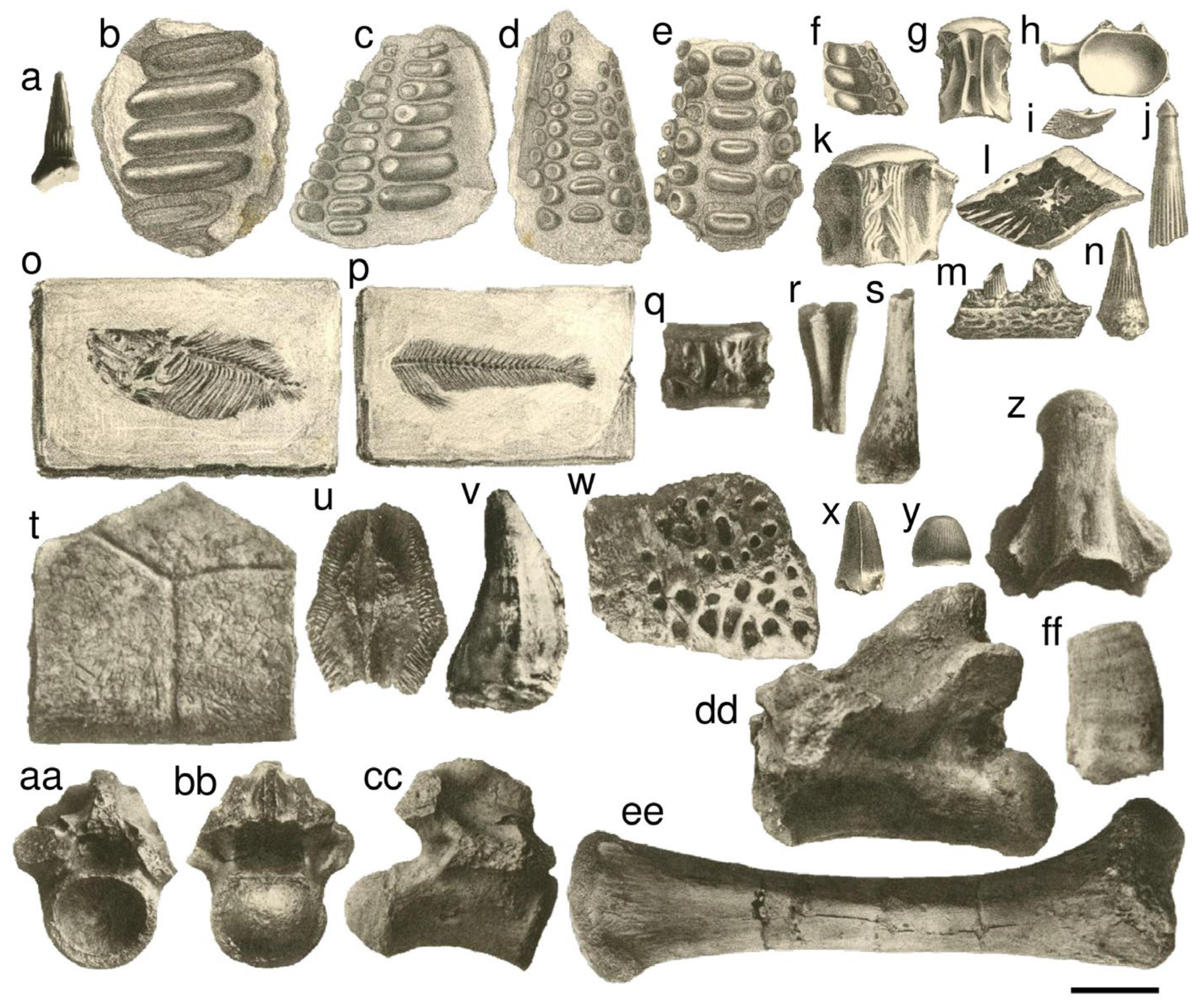 | * Lepidosteus pustulosus | MG 84 (lectotype) | Nine scales, one vertebral centrum, and two teeth (jawbone missing from the collection) |