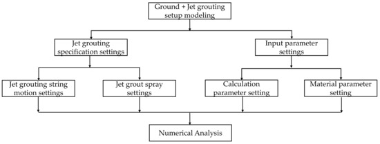 The optimization of the jet grouting simulation by MPS-CAE technology includes numerous distinct operations. Figure 1 shows the progressive stepwise tasks that are required to be achieved for the numerical analysis of jet grouting technology.