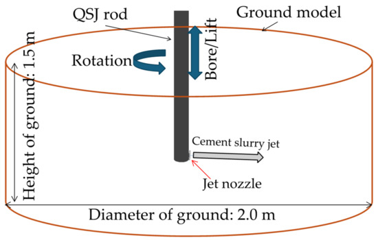 The modeling of the analysis ground and jet grouting setup is carried out using Computer-Aided Engineering (CAE) technology. As the name suggests, CAE is a broad term that refers to the group of technologies used to simulate and analyze complex engineering systems, while adjusting for the site-specific conditions. It is achieved using prototypes and models created with Computer-Aided Design (CAD) software Version 24.0 [8,9,10]. These tools enable the analysis and visualization of complex simulations by utilizing detailed representative prototypes and models. During the modeling phase, there are two key consideration factors in order to create an optimal model for jet grouting simulation. Firstly, the size of the prototype should be appropriate to ensure that the calculation points are sufficiently numerous for an accurate simulation but not large to incur exponential calculation load. If the prototype is too small or too large, the simulation’s accuracy and efficiency may be compromised. Next is the modeling of the entire setup required for analysis, which includes the ground model and the jet grouting equipment. While the size of ground model is scaled down, the jet grouting equipment is simplified by the single jet grouting string to illustrate the positioning, drilling, and jet grout spraying procedures. Figure 2 shows the scaled down ground model and jet grouting setup used for the study.