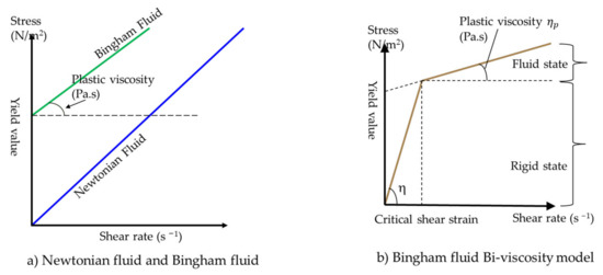 As for the remaining soil element, it is widely accepted to represent it by Bingham fluid in simulation [13,14,15,16,17] due to its defining characteristics of yield stress and viscosity [18]. However, the soil in question will initially exist in a solid state and cannot be accurately classified as a true fluid. Hence, it creates a challenge in analyzing the behavior of a soil in its rigid state, where the shear stress does not exceed the yield stress [19]. Since the accuracy of simulations hinges on employing an appropriate rheological model, a modified Bingham fluid approach is required to capture the complex rheological behavior of the soil [20,21]. To address this limitation, the Bingham fluid bi-viscosity model is employed, which accounts for the dual nature of the soil, treating it as a viscous-plastic fluid when in a fluid state and as a highly viscous material when in a rigid state [22]. Equations (6) and (7) define the apparent viscosity of Bingham fluid bi-viscosity model in a fluid state and rigid state respectively. Figure 3 shows the comparison on schematic diagrams of Newtonian fluid, Bingham fluid model and bi-viscosity Bingham model.