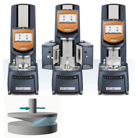 The B-type viscometer operates by attaching spindles of varying sizes, which are submerged in the fluid and rotated to measure its rheological properties [28]. The torque generated on the spindle’s rotating shaft quantifies the fluid’s resistance to flow, providing insights into its rheological behavior. Similarly, a rheometer functions based on the same principle but features a more advanced design with additional capabilities. In this device, a thin layer of fluid is applied to a base plate, and the spindle interacts with the fluid. The rotation of the spindle allows for the measurement of more complex rheological properties, along with real-time monitoring during the process [29,30,31].