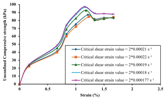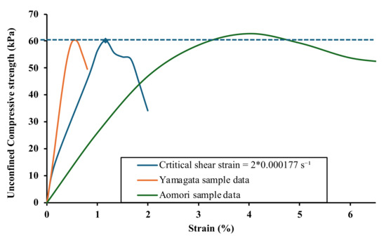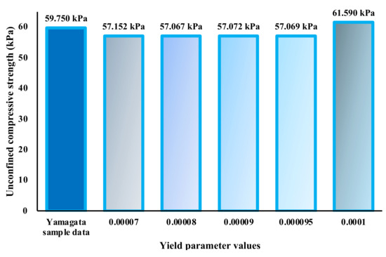 Figure 9 shows sensitivity analysis for the yield parameter compared with the Yamagata soil sample in order to determine the exact representative yield parameter value in simulation for all soil types. The critical shear strain value for each case is 2 × 0.000177 s−1 and the most accurate result was obtained when the yield parameter value was set as 0.0001 with the curve characteristics as shown in Figure 8. In contrast, all other cases produced an approximate strength of 57 kPa at the strain value of 1.2%. Thus, it can be inferred that the best fitting material parameter for this specific soil sample are a yield parameter value of 0.0001 and critical shear strain value of 2 × 0.000177 s−1.