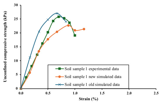 Figure 8 shows the simulated stress–strain curves compared to the two benchmark datasets with approximately equal unconfined compressive strengths, using the recalculated critical shear strain value of 2 × 0.000177 s−1. This recalculated value effectively reproduced accurate stress–strain curves for new soil samples of approximately 60 kPa unconfined compressive strength indicated by the blue dashed line. An output strength of 61.59 kPa at a strain of 1.162% was recorded for an input plastic viscosity of 17,000 Pa.s and a yield parameter value of 0.0001.