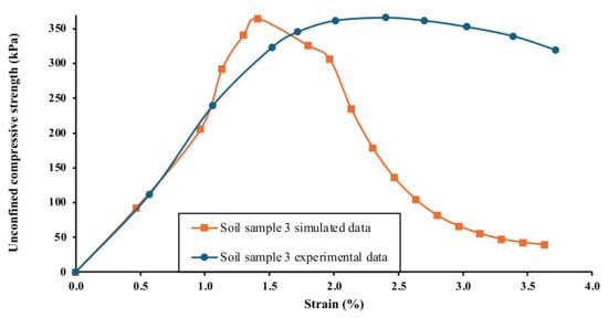 The limitation of the old reverse parameter fitting simulation was the requirement to repeat the whole guideline from scratch to determine the material parameter of the new soil sample. This made the guideline incomplete and ambiguous, particularly for soil samples with unconfined compressive strengths different from samples 1 and 2. In this study, representative critical shear strain and yield parameter values were determined from a 61.55 kPa soil sample and a 100 kPa soil sample, respectively. These parameters were then tested on soil samples with unconfined compressive strengths of 25.8 kPa and 39.5 kPa, generated accurate results. However, the method still required verification for soil strengths higher than those used to establish the representative values. Figure 12 shows the result of verification simulation conducted on higher-strength soil samples. For soil sample 3, with an unconfined compressive strength of 366.19 kPa, the simulated yield strength was 364.16 kPa, demonstrating excellent agreement. Thus, after the successful verification with the five different soil samples of different range of strength, it can be confirmed that the representative yield parameter and critical shear strain is applicable for all soil types.