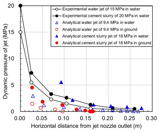 The selection of jet grouting pressures (9.4 MPa, 15 MPa, 18 MPa, and 20 MPa) was based on commonly observed pressure ranges reported in previous studies and practical applications of jet grouting technology [5,6]. Specifically, 9.4 MPa and 18 MPa represent typical pressures for low and high-pressure jet grouting methods, respectively. Intermediate pressures, such as 15 MPa and 20 MPa, were selected to evaluate transitional behaviors and to ensure that the analytical model can capture a wide range of operational conditions. These pressure values align with industry standards and serve as benchmarks for comparing simulation results with experimental findings.