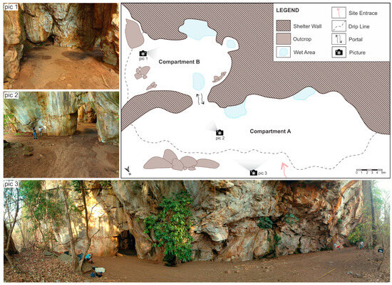 The site is divided into two main areas, referred to as Compartment A and Compartment B (Figure 2). Compartment A has an opening of 43 m and a height of 13 m, with a ceiling high enough to allow sunlight to reach its deepest interior. Compartment B is marked by a depth of 29 m, an entrance of 23 m, and a high ceiling. The constant presence of water dripping contributes to the formation of a small permanent pool [1].