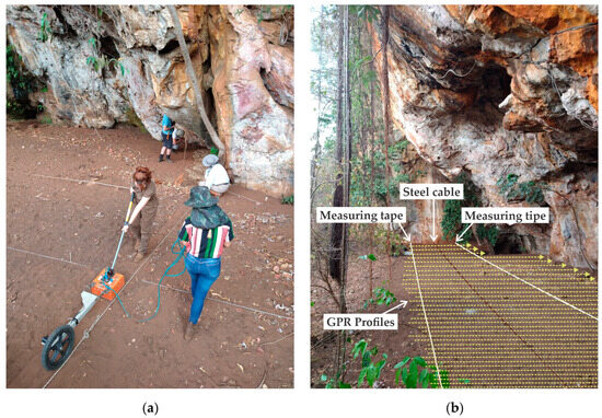 The coordinate of this reflection in each profile, that is, its occurrence at “x” meters, is linearly adjusted between parallel profiles to ensure correlation between them. To generate this common reflection point across all profiles, a steel cable was placed on the surface between two measuring tapes (Figure 3b). This methodology ensures acquisition accuracy through the adjustment of 2D profile positioning, performed during pre-processing, standardizing the steel-cable reflection positions visible in the radargrams.