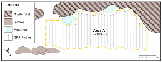 Data acquisition consisted of 290 parallel GPR profiles, acquired with 10 cm spacing, covering an area of approximately 250 m², designated as Area A1 (Figure 4).