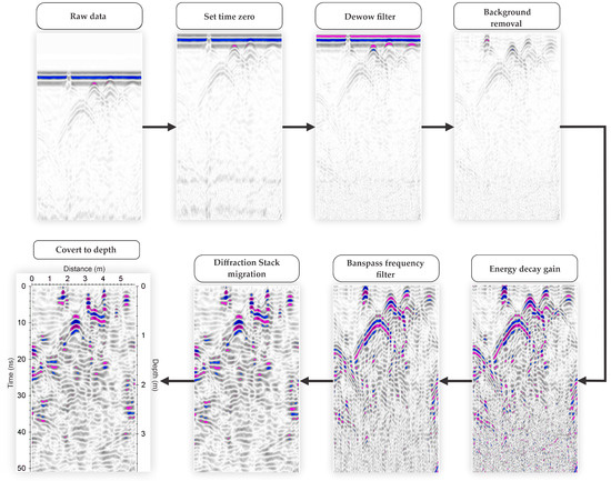 The 2D GPR data processing was performed using ReflexW 8.5 software, following a sequence of steps to improve data quality and interpretability (Figure 5). The routine began with zero-time correction, which adjusts the start of the GPR signal time record to zero at ground contact. The Dewow filter was applied to remove unwanted low-frequency components, improving signal clarity, followed by background removal to eliminate systematic noise and enhance reflections of interest.