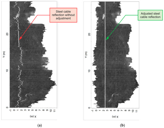 Depth slice of the generated pseudo-3D, showing without the steel-cable reflection adjustment (a) and after correction (b).