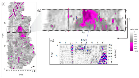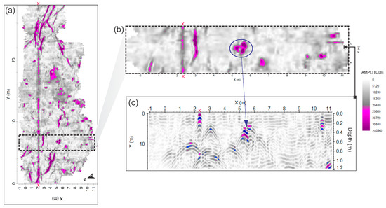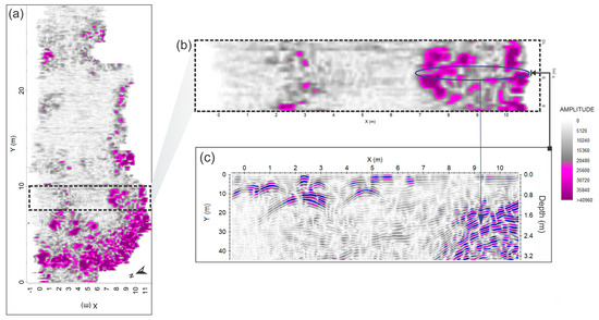 (a) Depth slice (40 cm) of the pseudo-3D block; (b) Detail of the pseudo-3D block depth slice showing anomalies from a set of rock blocks; (c) 2D profile (position 6.80 m) with the respective rock block reflection (RP-1). The x symbol (red) represents the steel-cable anomaly used in section georeferencing.